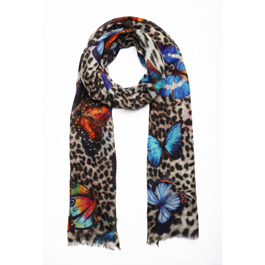 Butterfly Jungle Animal Print Scarf – Merino Wool Silk Designer Wrap | Leopard Pattern with Colorful Butterflies