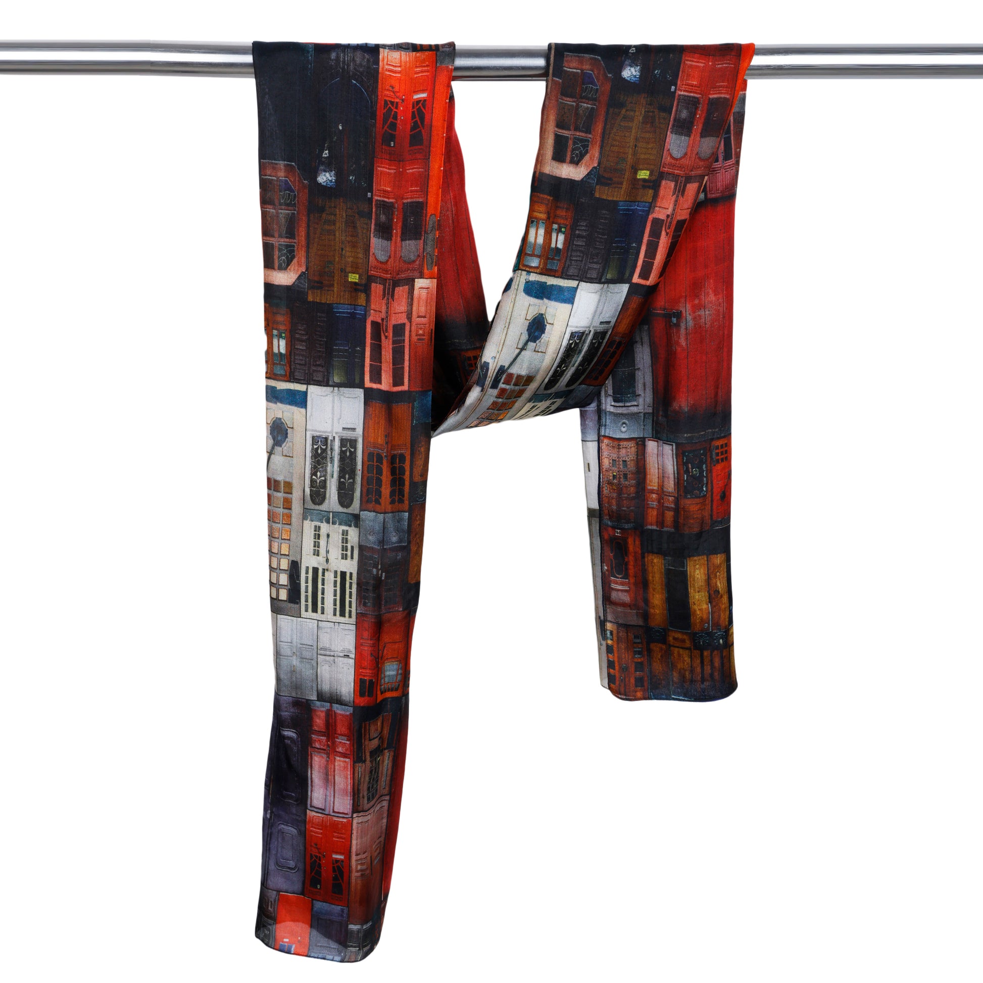 Architectural Red Doorway Art Scarf – Pure Silk Designer Wrap | Multicolor Abstract Heritage Print