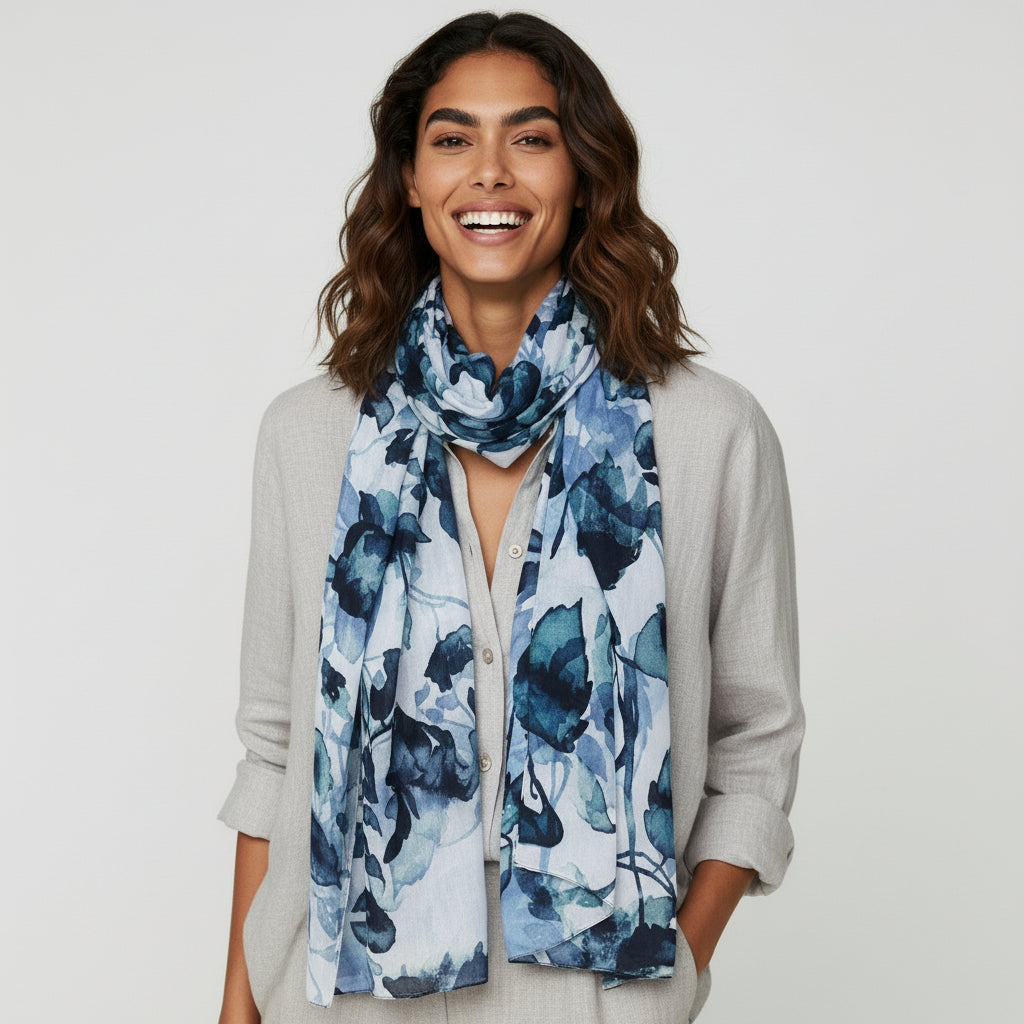Enchanted Noir Leaf Scarf – Modal Silk Designer Wrap | Black & Grey Botanical Abstract Print