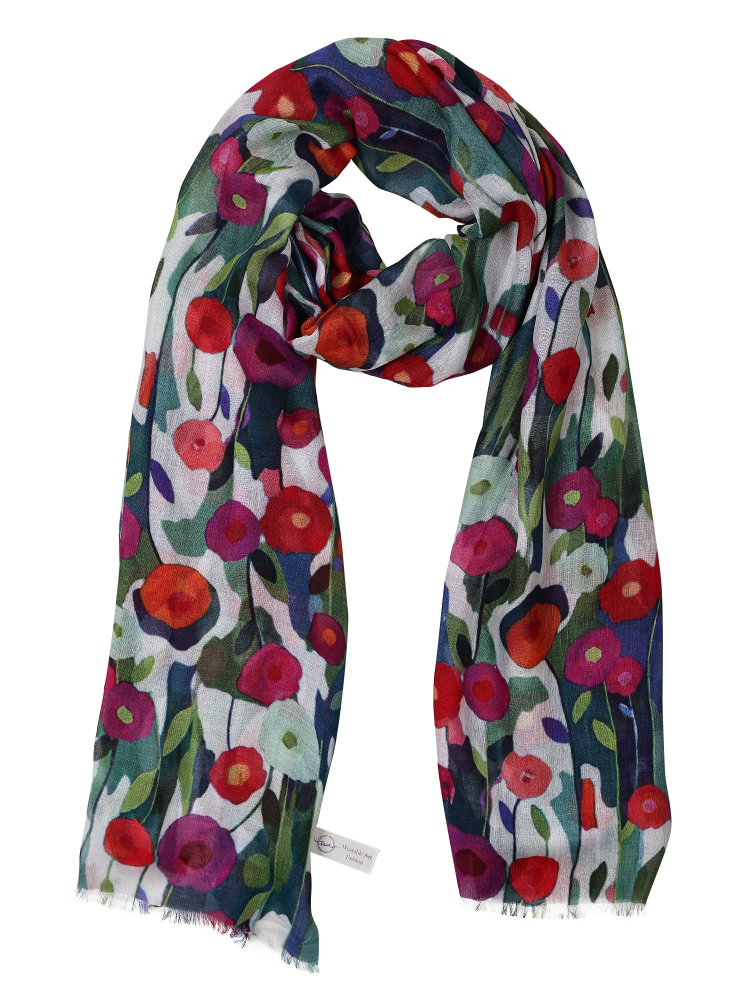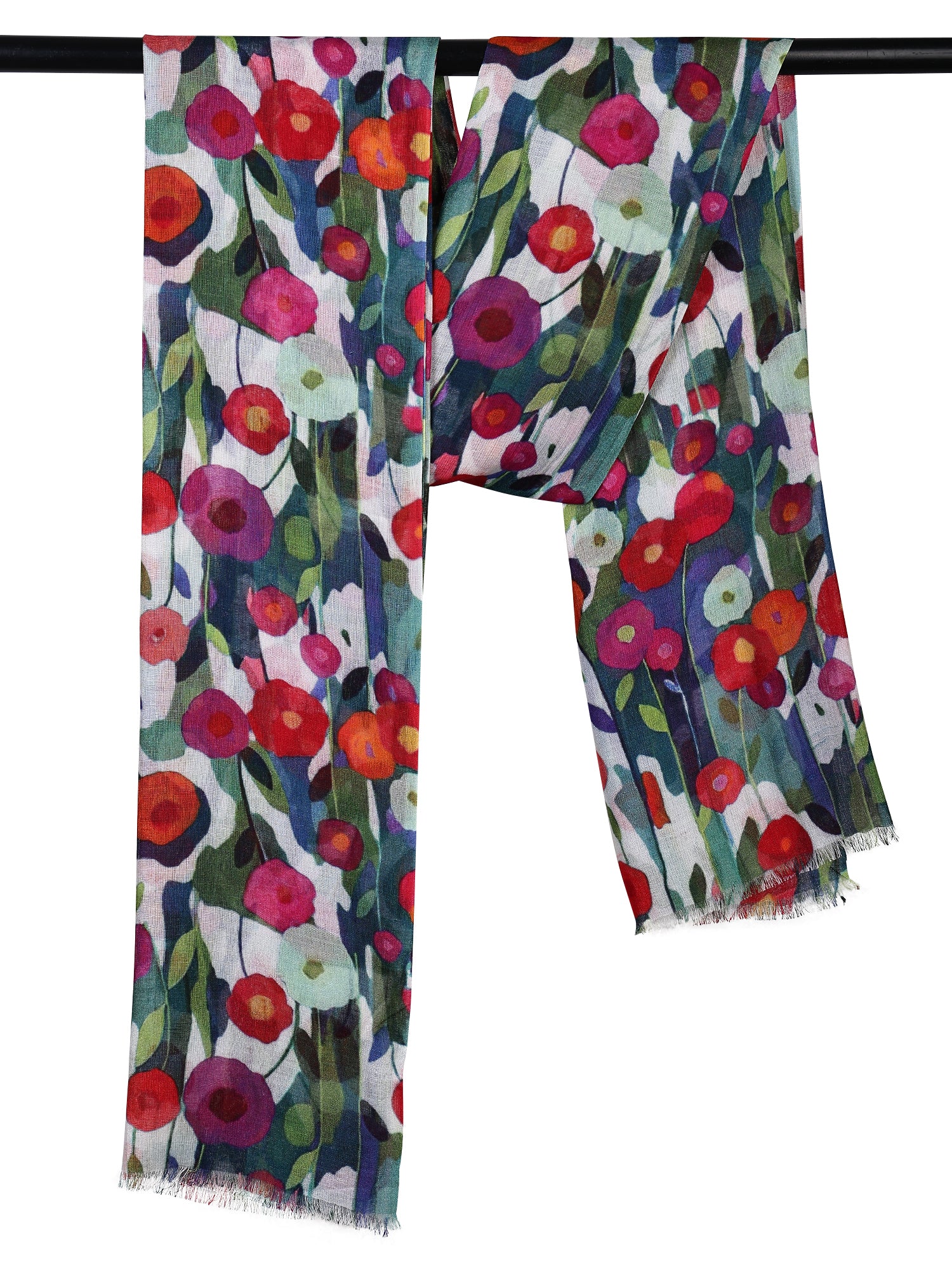 Wild Poppies Meadow Bloom Scarf – Fine Merino Wool | Colorful Abstract Floral Wrap with Teal Blue and Crimson Accents