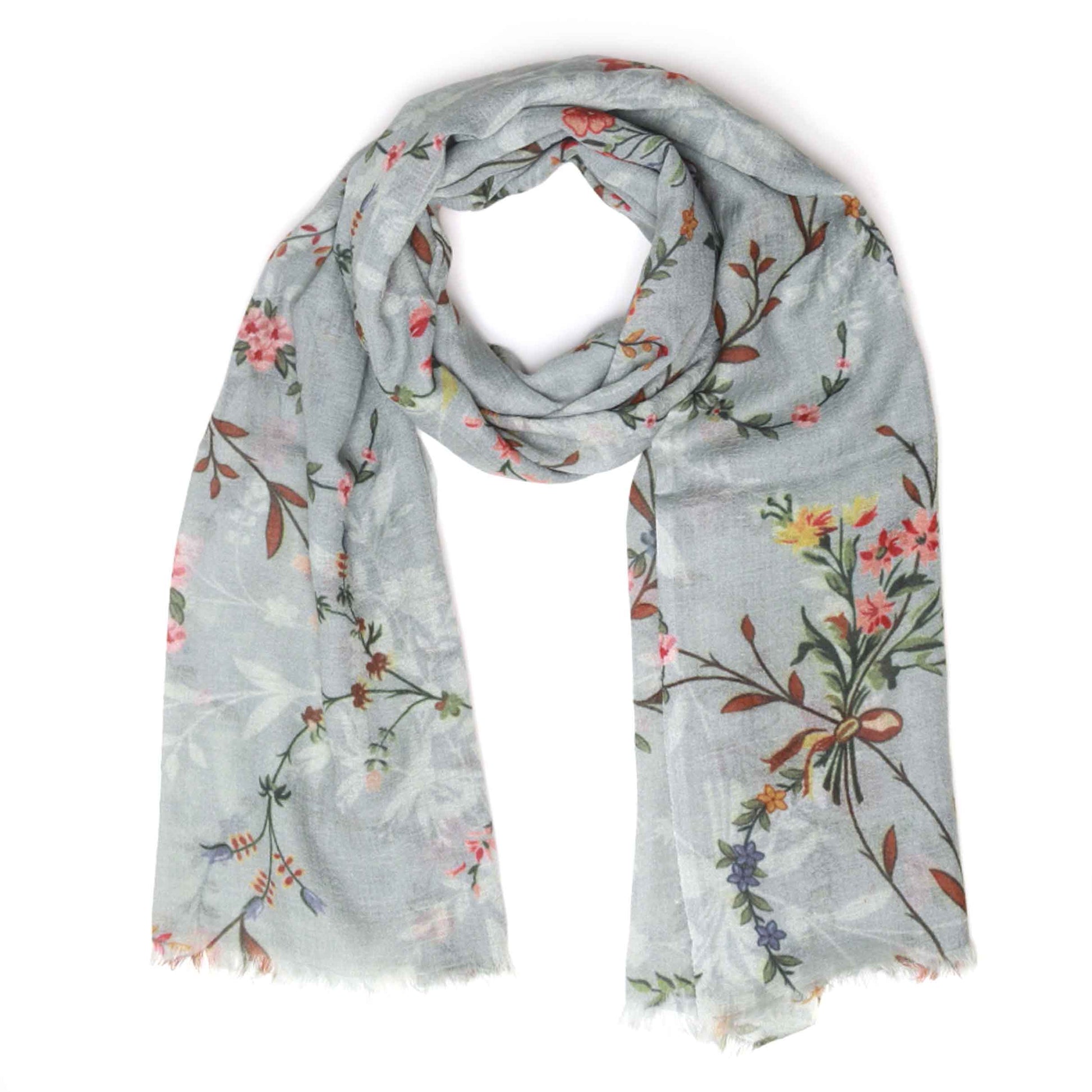 A refined fine Merino wool scarf featuring an elegant all-over botanical vine print set against a soft grey background. The design showcases delicate winding florals, leaves, and blossoms in muted tones of blush, soft coral, sage green, lavender, and warm brown, creating a graceful, nature-inspired composition with timeless appeal. Crafted in luxurious fine Merino wool with a gentle natural sheen, this scarf drapes effortlessly and feels beautifully lightweight while offering subtle warmth. Measuring 70 cm × 200 cm, it provides generous styling versatility—perfect for statement wrapping, relaxed draping, or adding a sophisticated botanical accent to everyday and occasion looks.