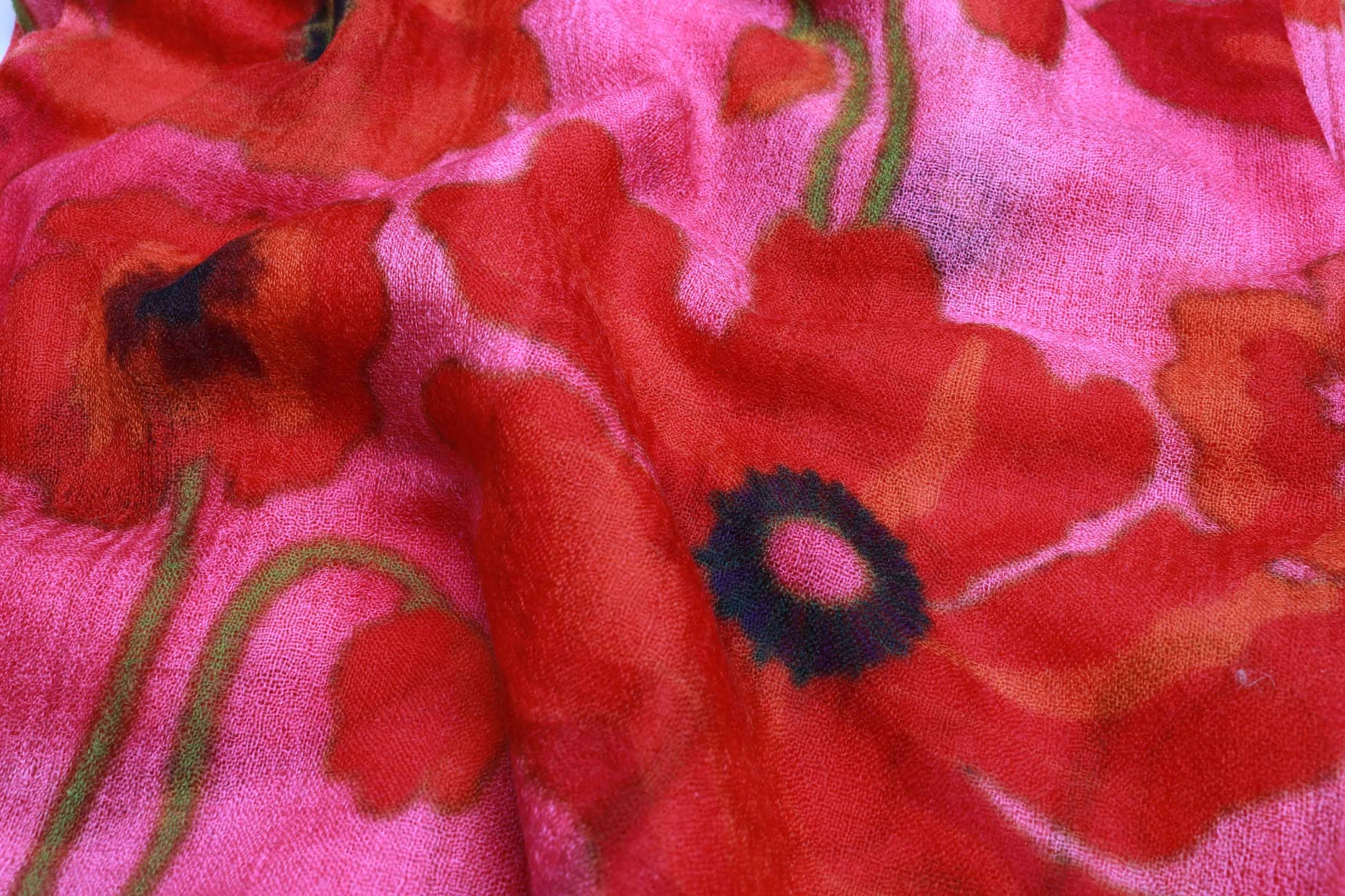 Poppy Bloom Scarf – Merino Fine Wool Wrap | Red & Scarlet Poppies on Radiant Pink Canvas