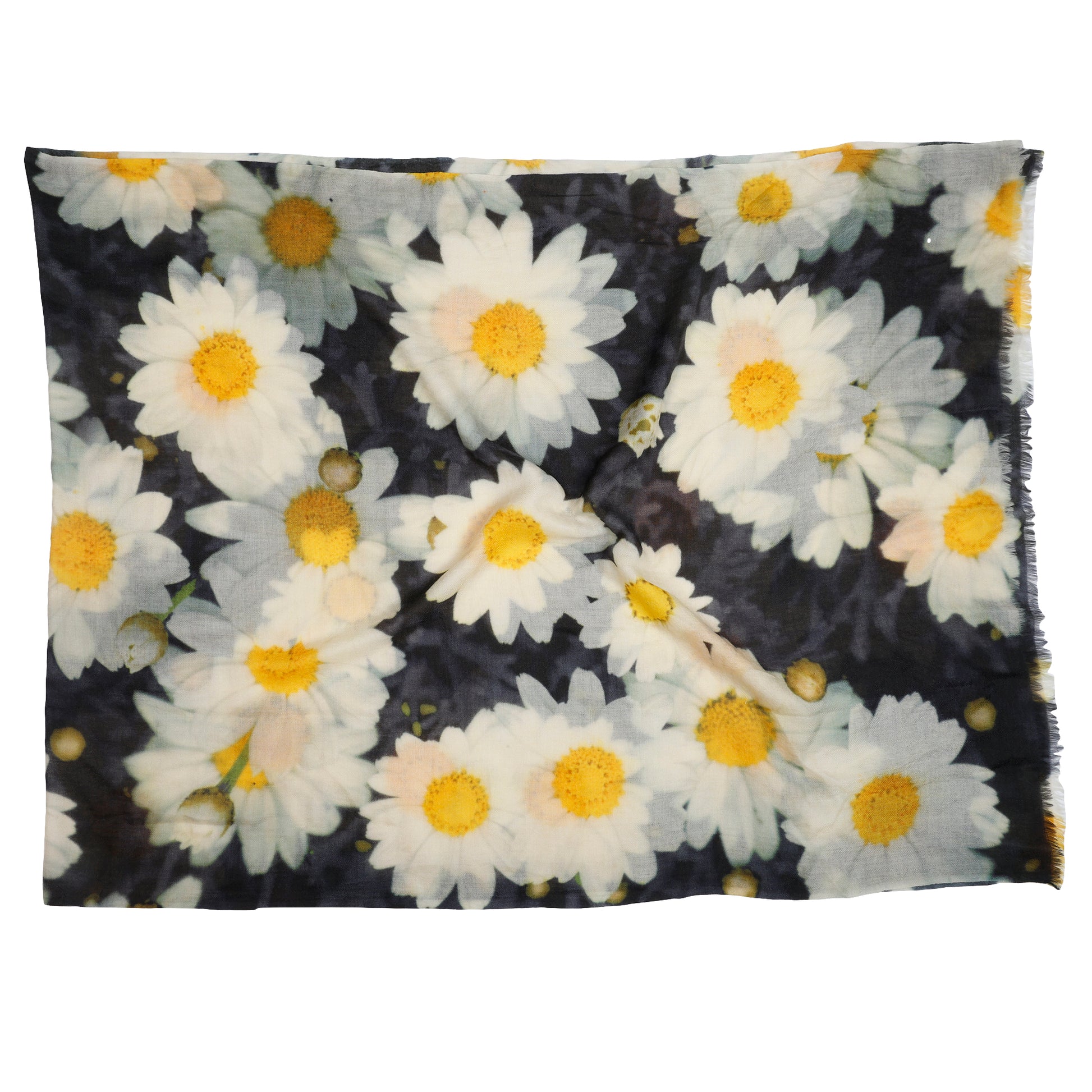 Golden Daisy Meadow Scarf – Fine Merino Wool | White Floral Botanical Print with Sunshine Yellow Accents