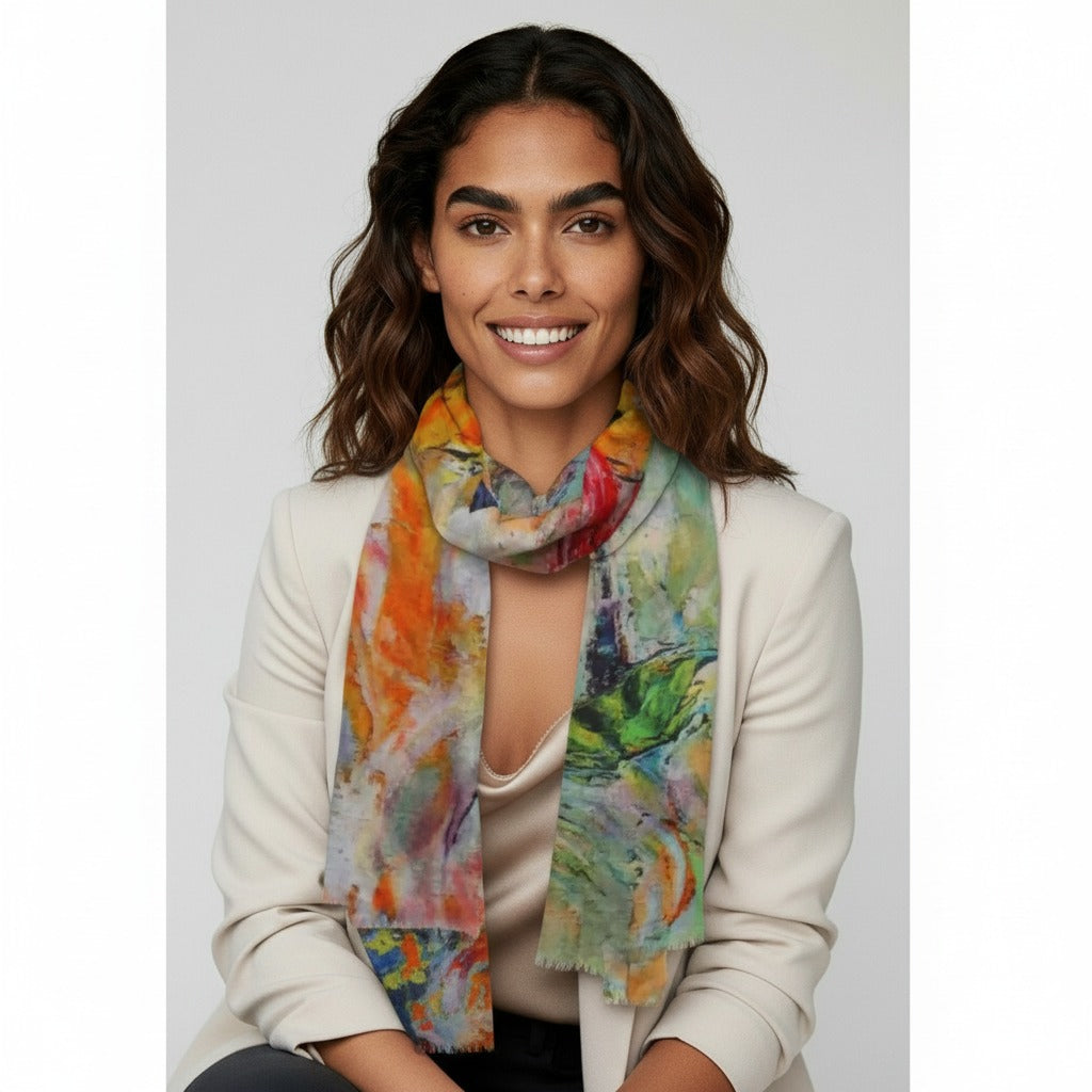 Rainy Day Romance Scarf – Premium Merino Wool Silk Wrap | Abstract Umbrella Walk in Bold Colours