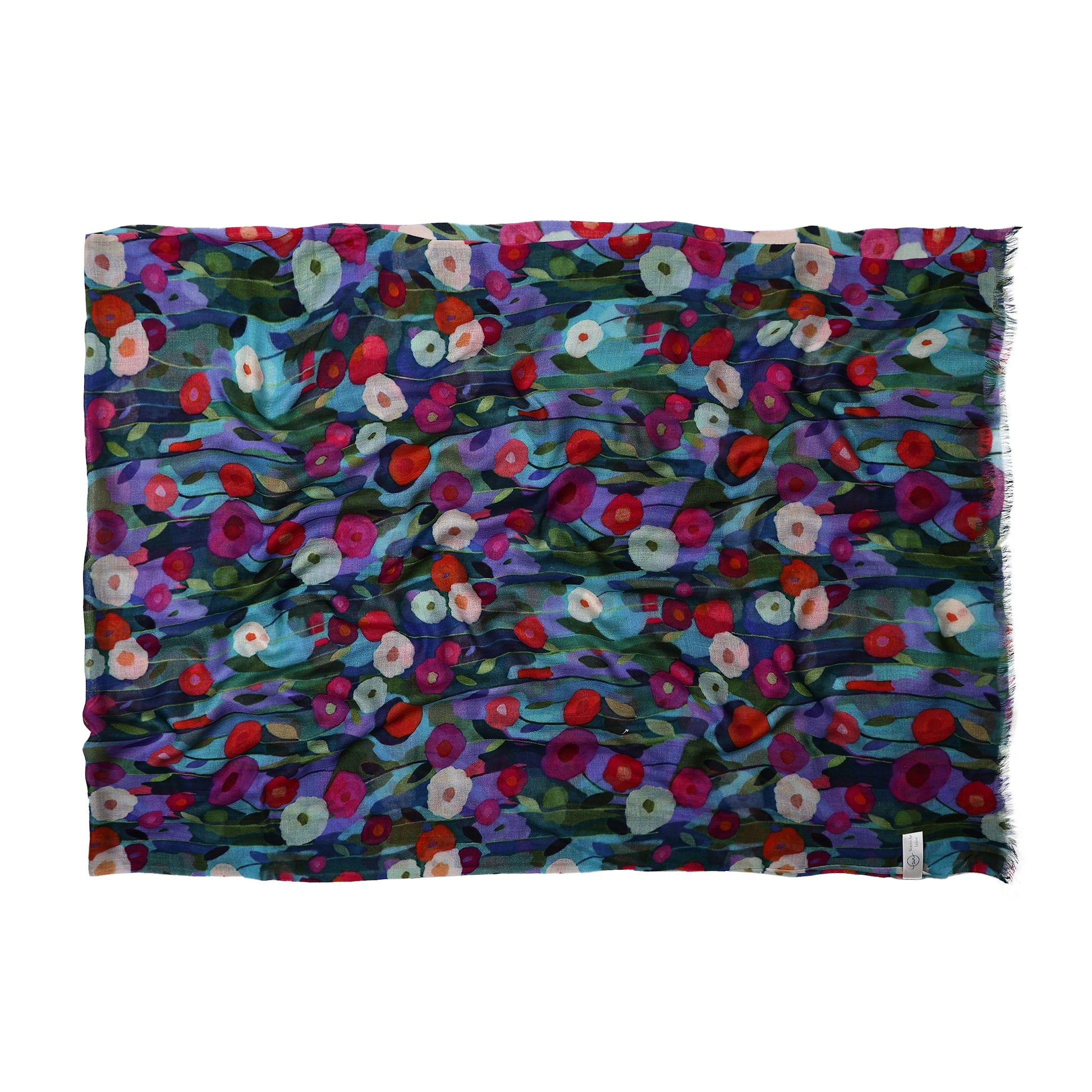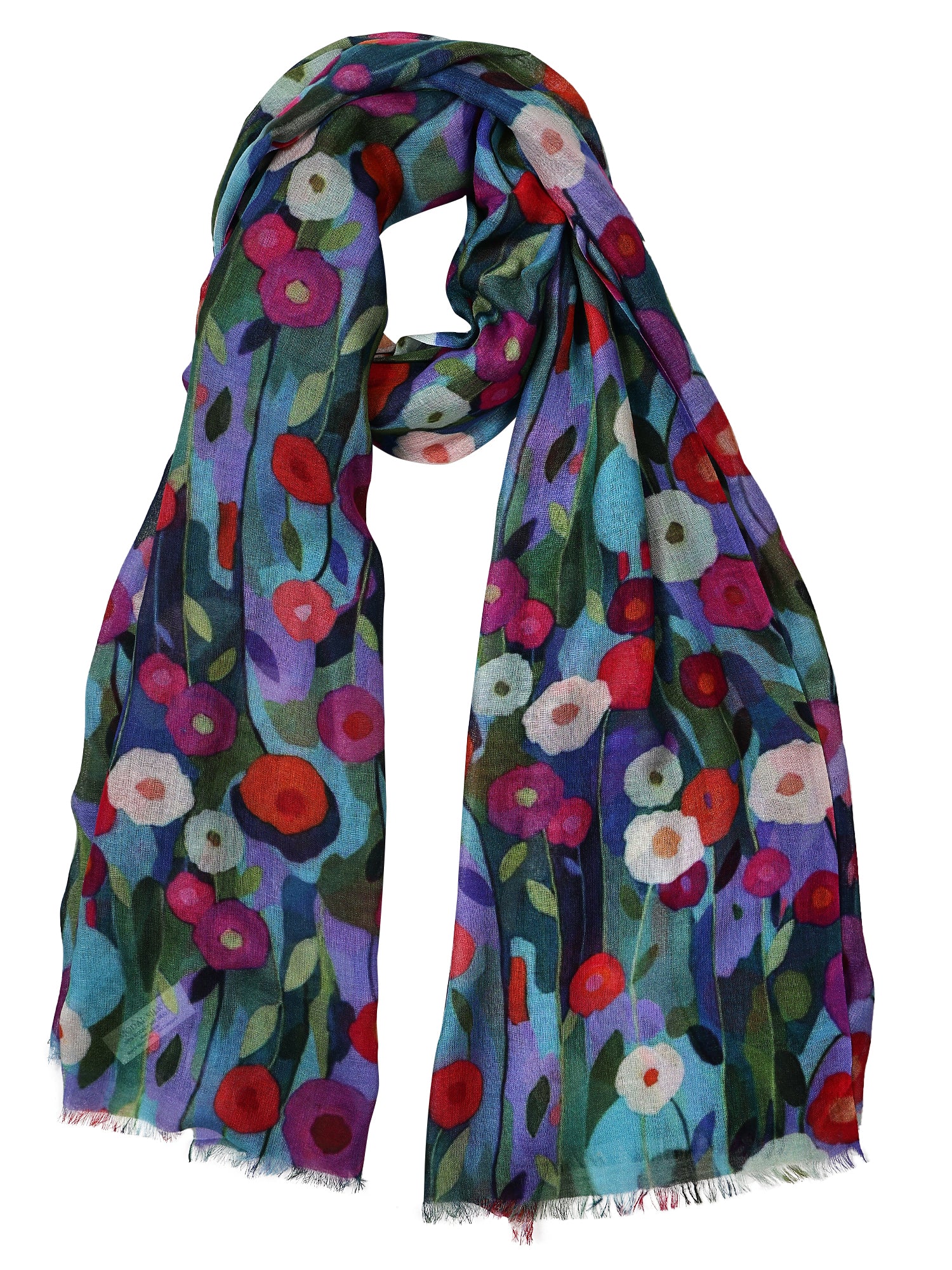 Azure Poppies Garden Bloom Scarf – Modal Silk | Artistic Floral Wrap with Bold Multicolor Blooms on Deep Blue Base