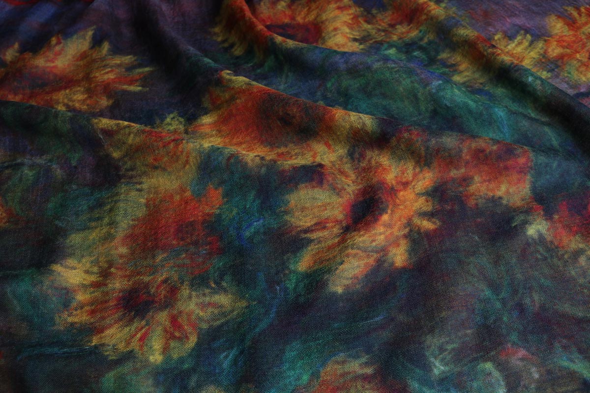 Sunflower Bloom Scarf – Merino Fine Wool Blend | Impressionist Floral Art Print Wrap