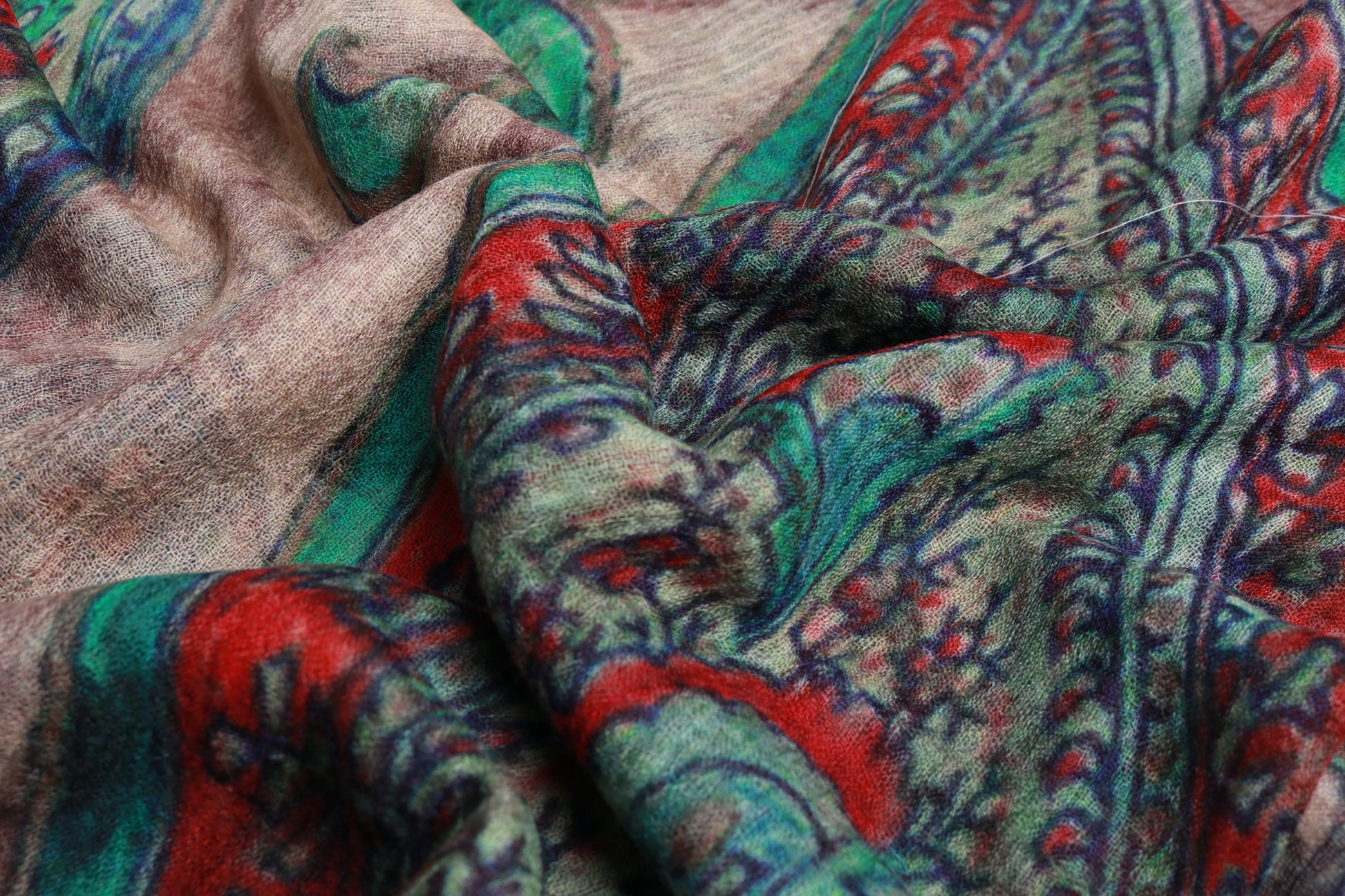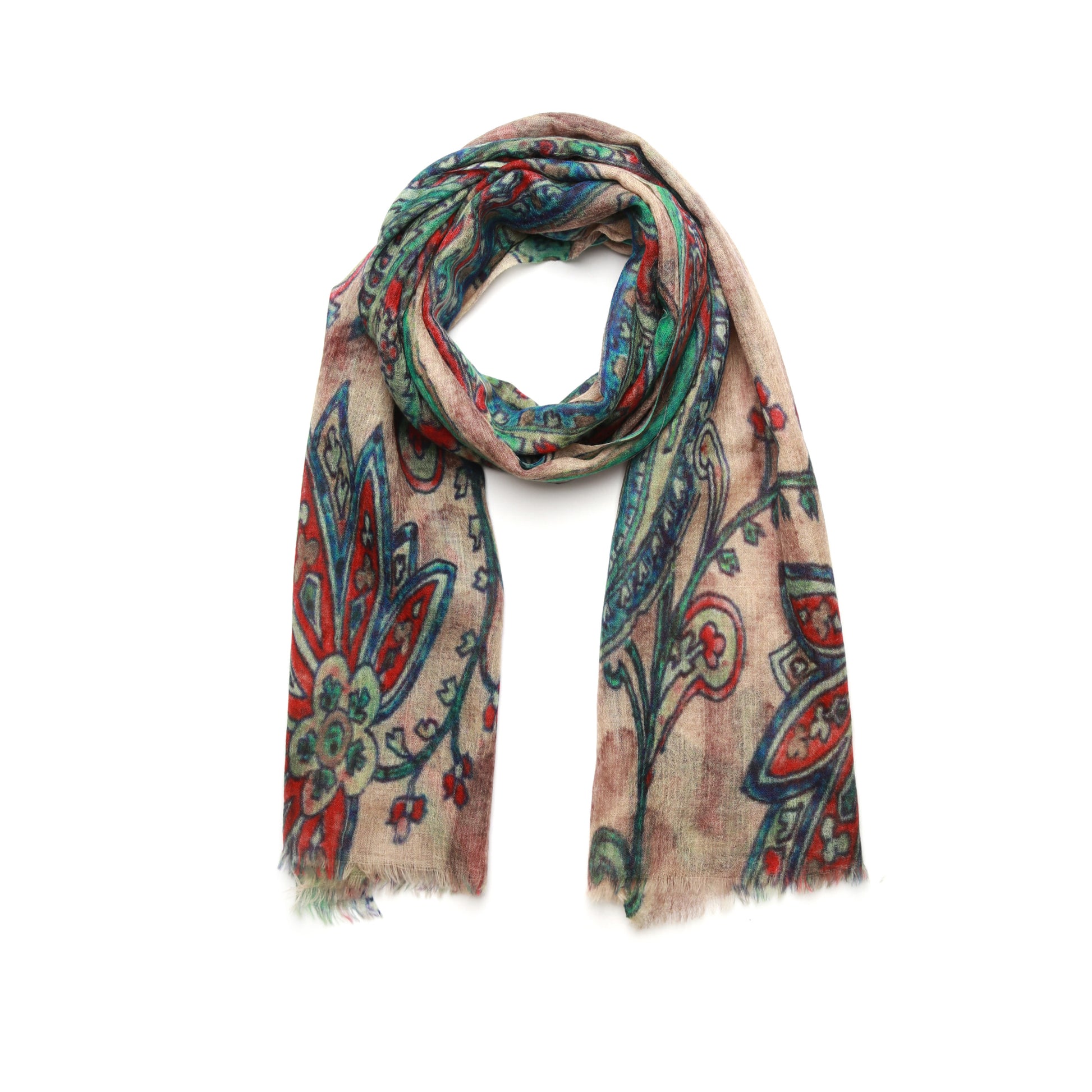 A refined Merino wool silk scarf featuring an intricate paisley and floral motif inspired by classic heritage artistry. The print blends elegant teals, soft aquas, muted reds, and delicate ivory detailing over a warm neutral background, creating a rich, ornamental composition with timeless appeal. Crafted in luxurious Merino wool silk with a soft natural sheen, this scarf drapes effortlessly and feels beautifully lightweight while offering gentle warmth. Measuring 70 cm × 200 cm, it provides generous styling versatility—perfect for statement wrapping, fluid draping, or adding a sophisticated artisanal touch to everyday and occasion looks.