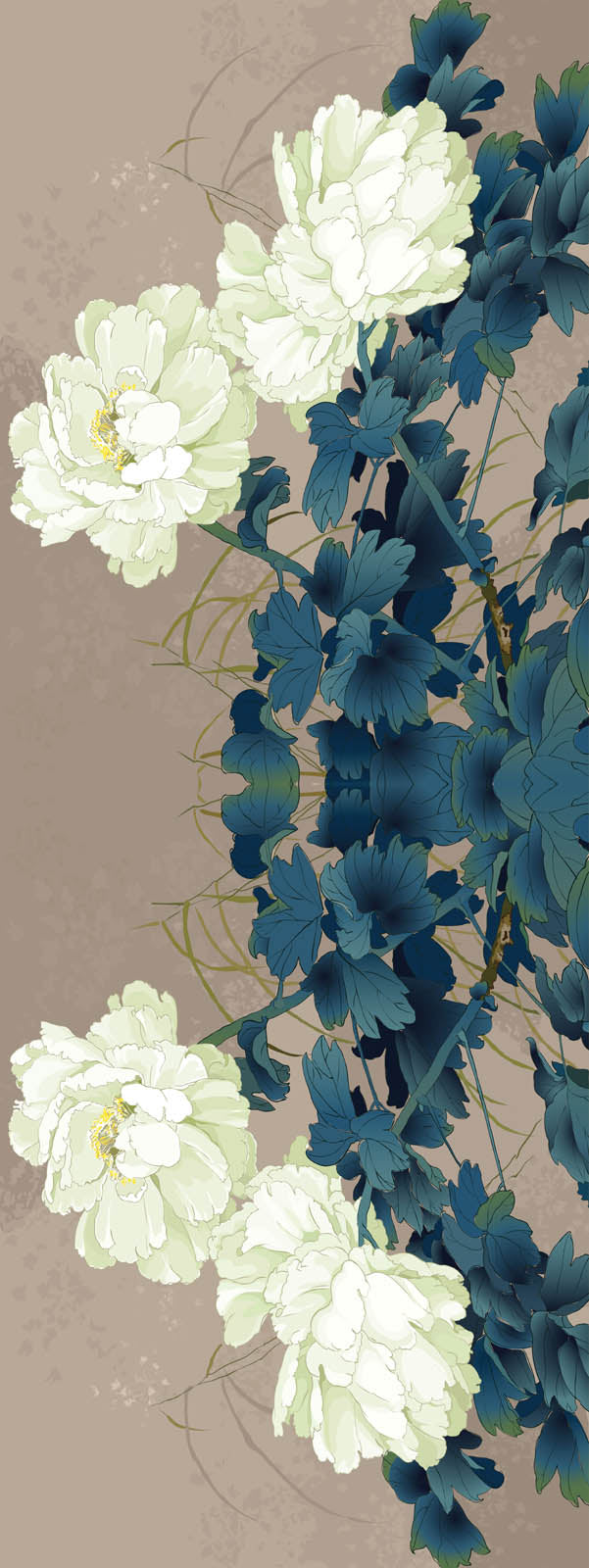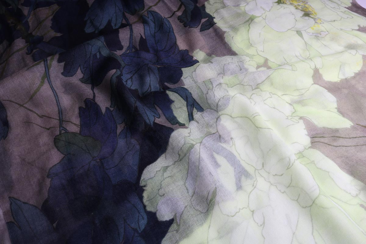 A sophisticated Merino wool silk scarf featuring graceful ivory peony blooms intertwined with deep teal and blue-toned foliage against a soft taupe background. The print blends gentle neutrals with rich botanical hues, creating a refined, serene composition with timeless floral elegance. Crafted in luxurious Merino wool silk with a soft natural sheen, this scarf drapes effortlessly and feels beautifully lightweight while offering subtle warmth. Measuring 70 cm × 200 cm, it provides generous styling versatility—perfect for elegant wraps, fluid draping, or adding a polished botanical accent to everyday and occasion looks.