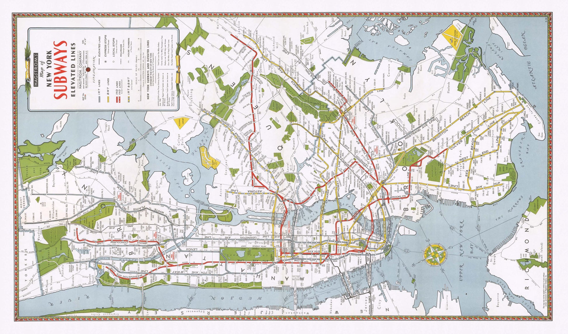 The print showcases vintage-style red, yellow, and green route markings, station names, rivers, parks, borough boundaries, and the unmistakable charm of early NYC cartography.