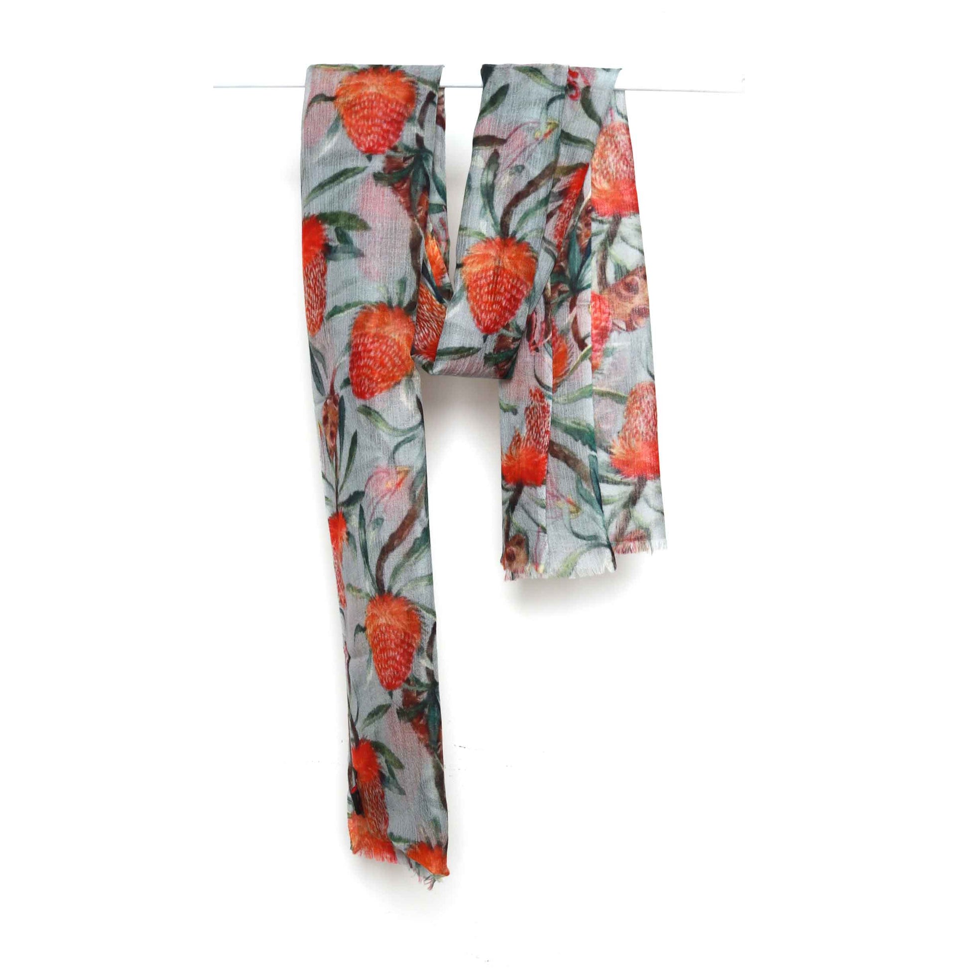 Banksia Blossom Scarf – Premium Merino Fine Wool Wrap | Native Australian Coastal Botanicals on Soft Grey