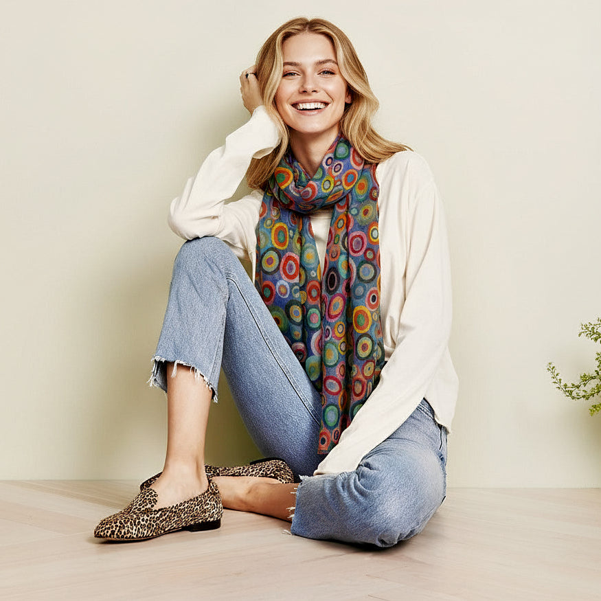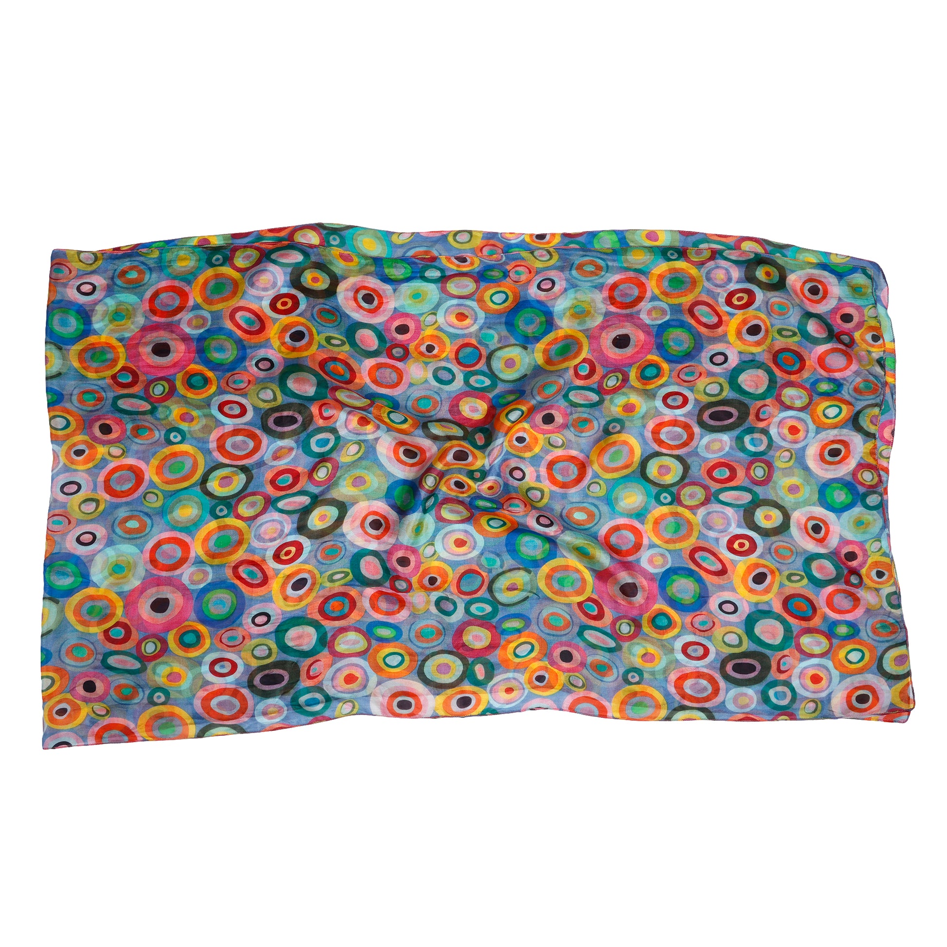 Kaleidoscope Circles Scarf – Pure Silk | Vibrant Geometric Abstract Designer Wrap - Grey base