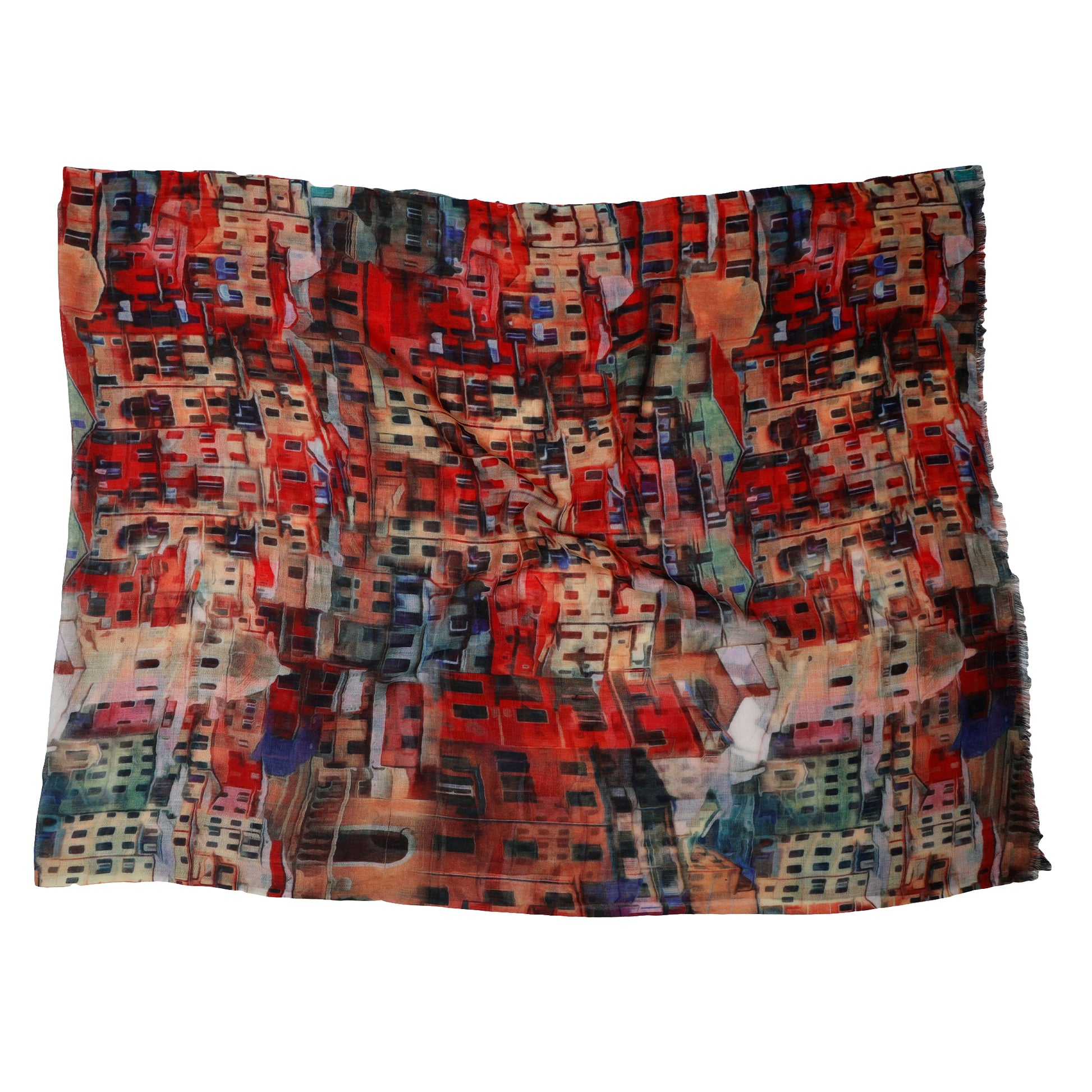 Cinque Terre Charm Scarf – Merino Wool Silk| Italian Coastal Village Print in Vibrant Red & Pastel Tones