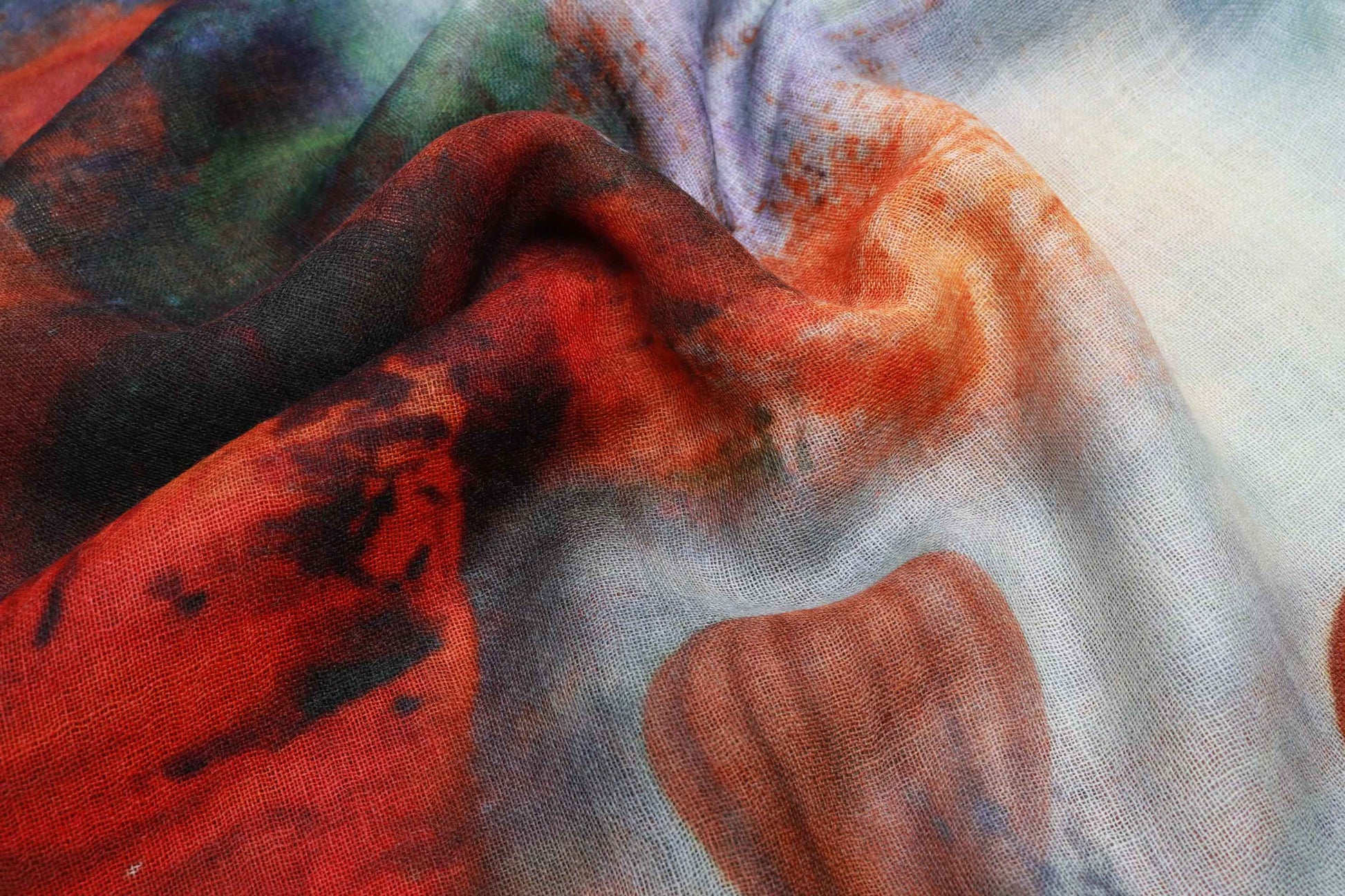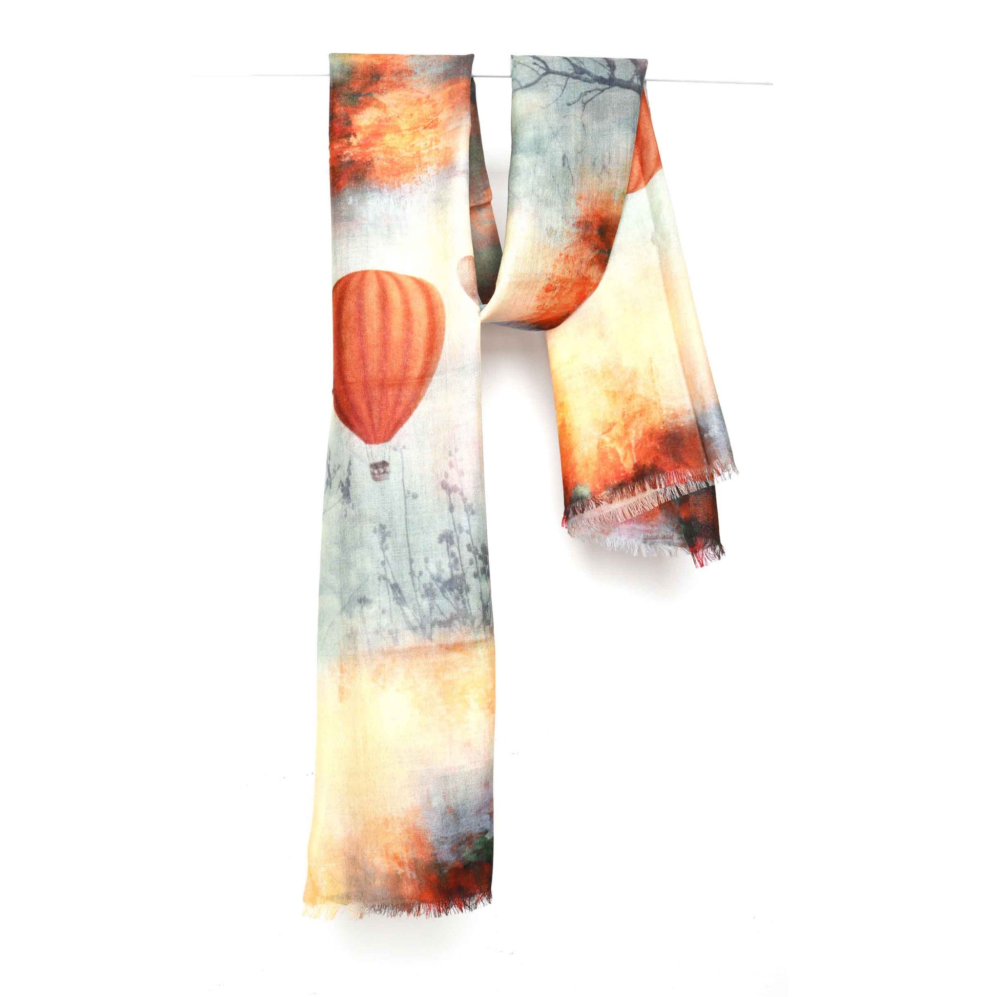 Autumn Sky Balloons Scarf – Merino Wool Silk Wrap | Abstract Floating Dreams in Fiery Sunset Hues