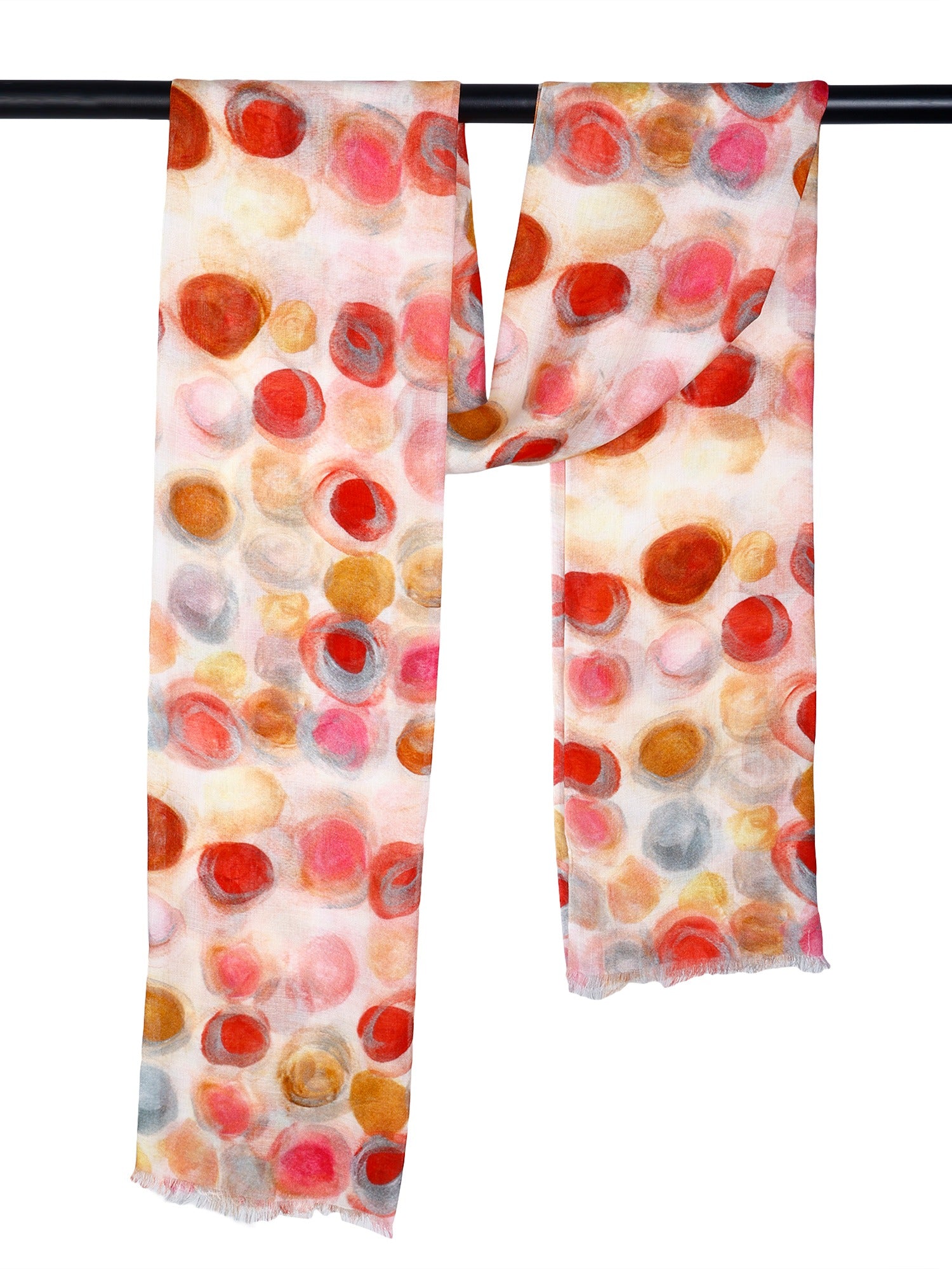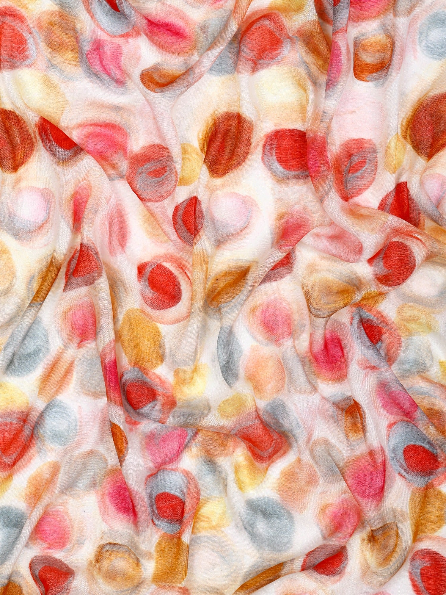 Add a splash of color to your wardrobe with the Abstract Modal Silk Designer Scarf, featuring a vibrant pink base adorned with playful red, yellow, and orange round dots. Crafted from a luxurious blend of 90% modal and 10% silk, this scarf offers a unique, soft, and durable fabric that combines elegance with versatility.