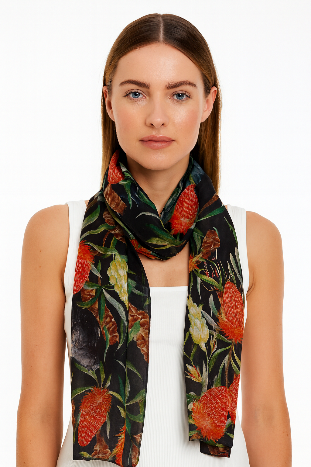 Merino Wool Scarf – Golden Finch & Crimson Bloom Print