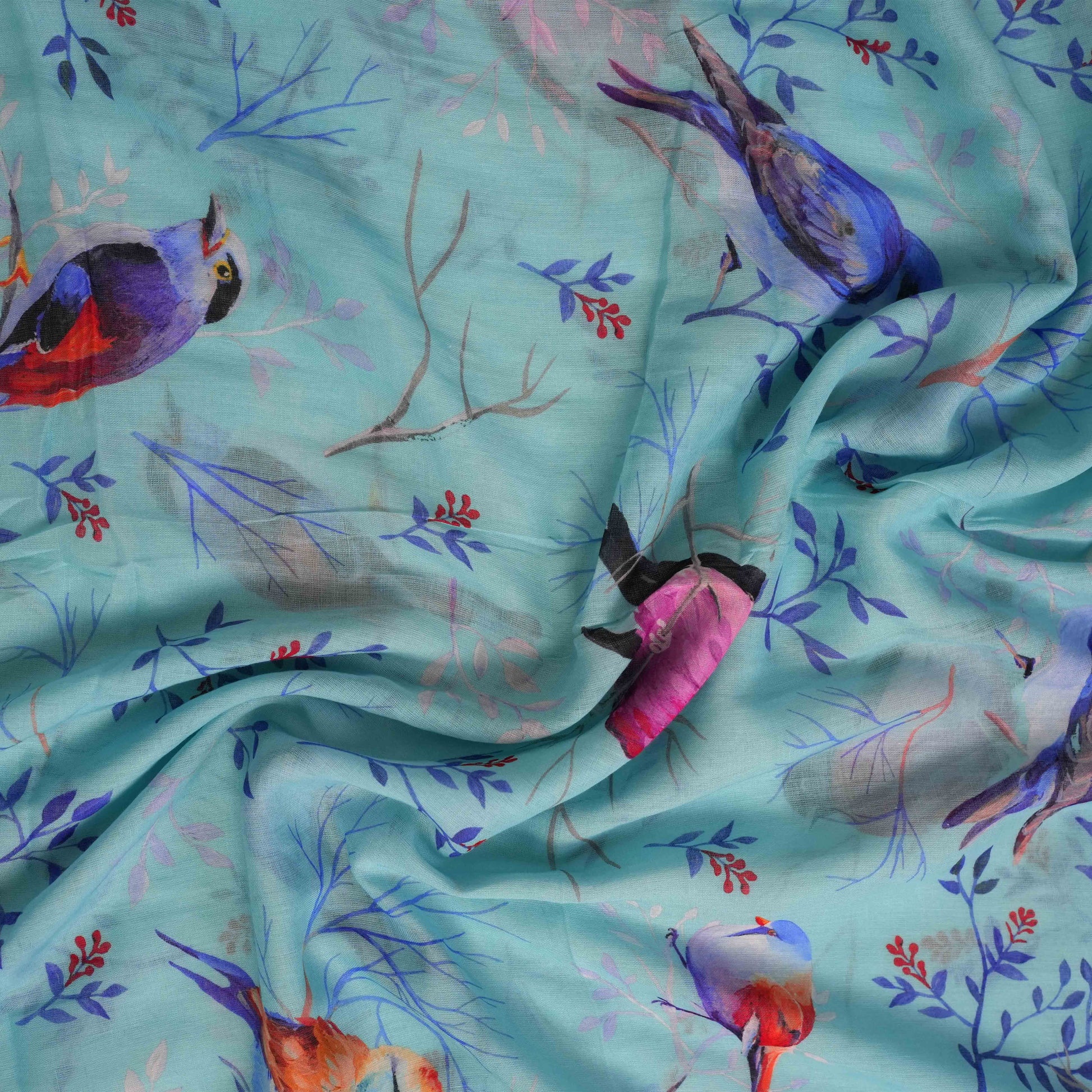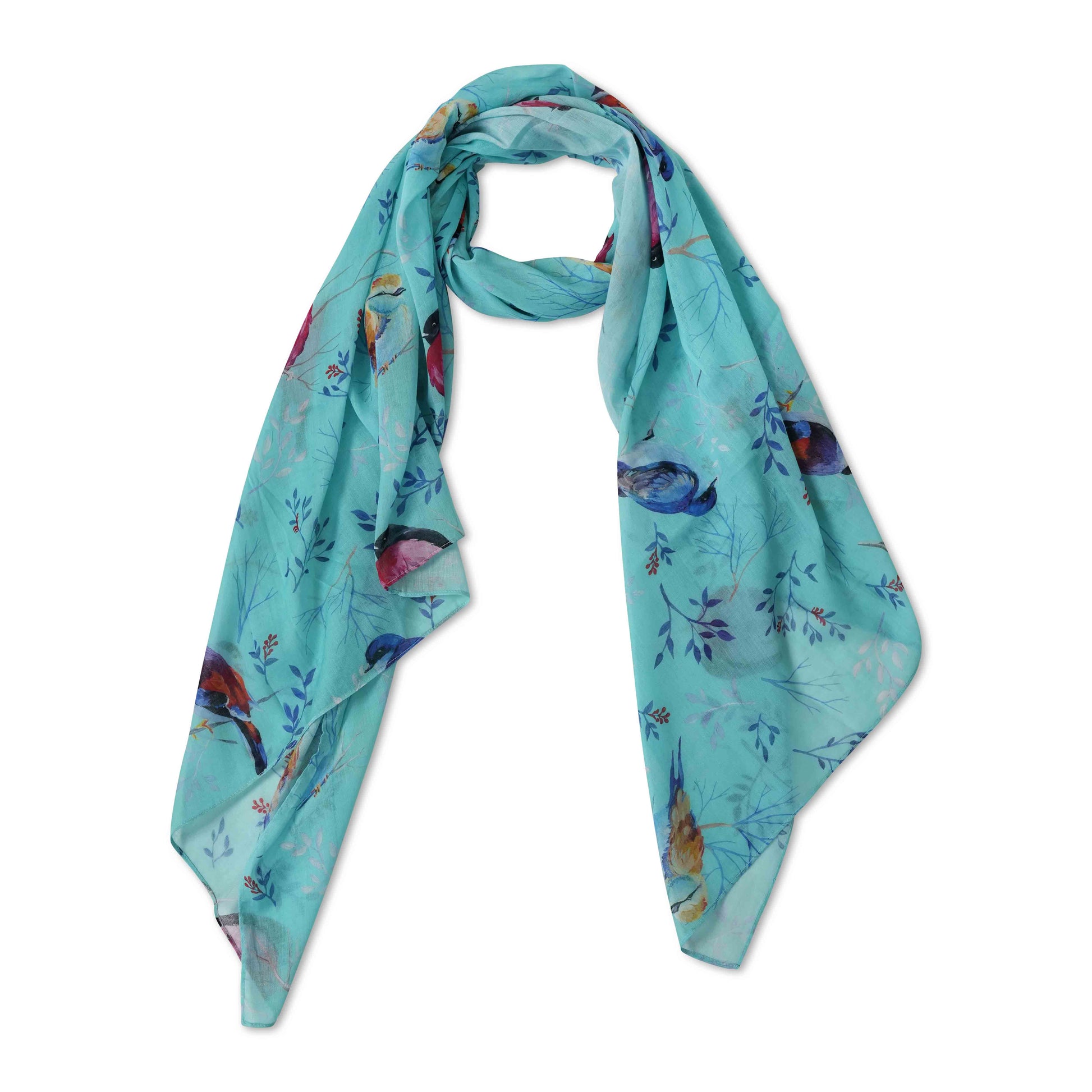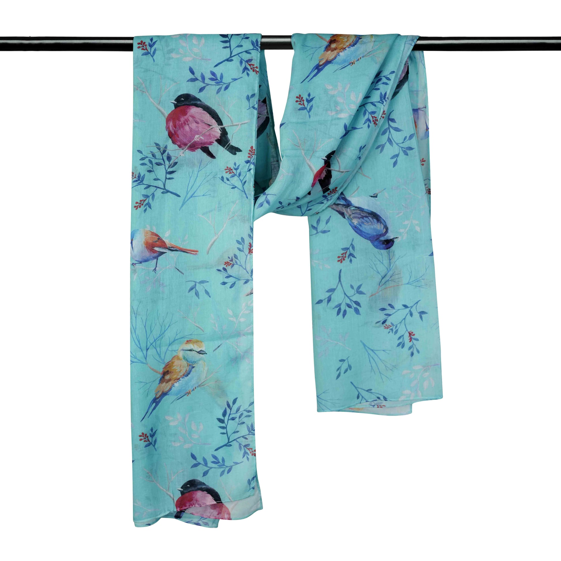 Tropical Bird Scarf – Cotton Modal Blend | Colorful Songbird & Botanical Print on Aqua Blue