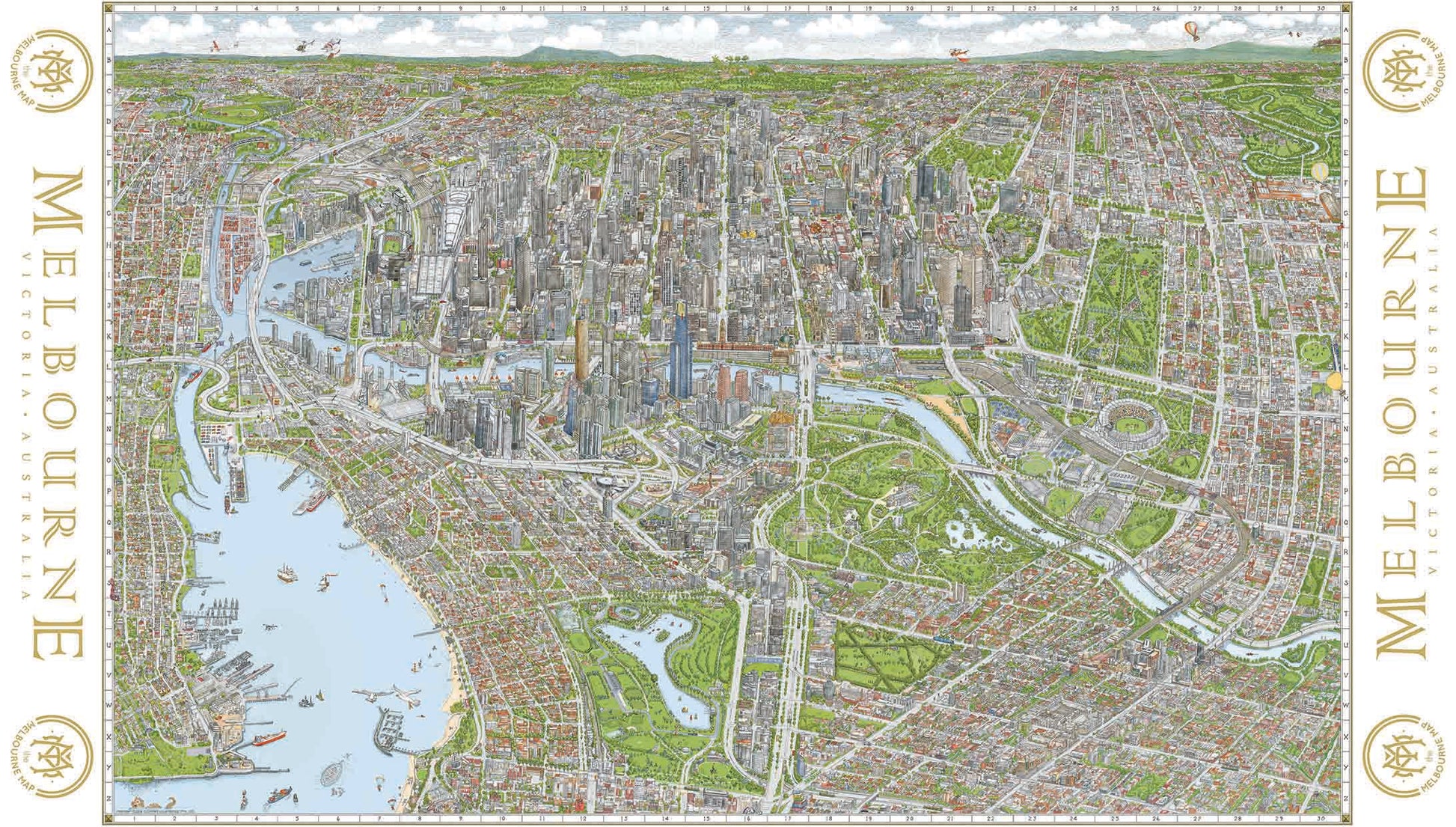 Design Theme: Illustrated Melbourne city map with detailed suburbs, rivers, parks and iconic landmarks