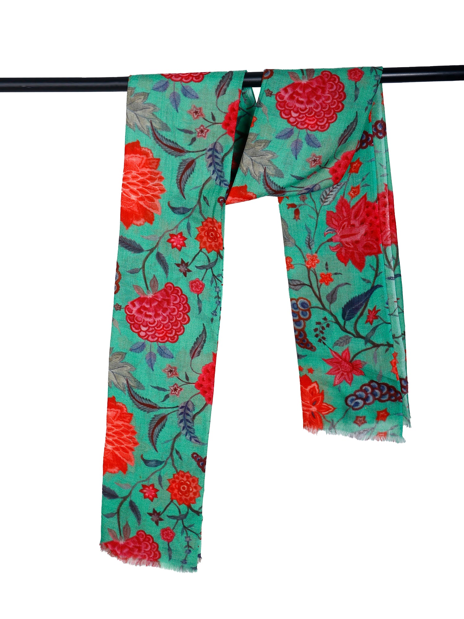 Botanical Bloom Scarf – Merino Fine Wool Wrap | Vibrant Pink & Red Flowers on Emerald Green