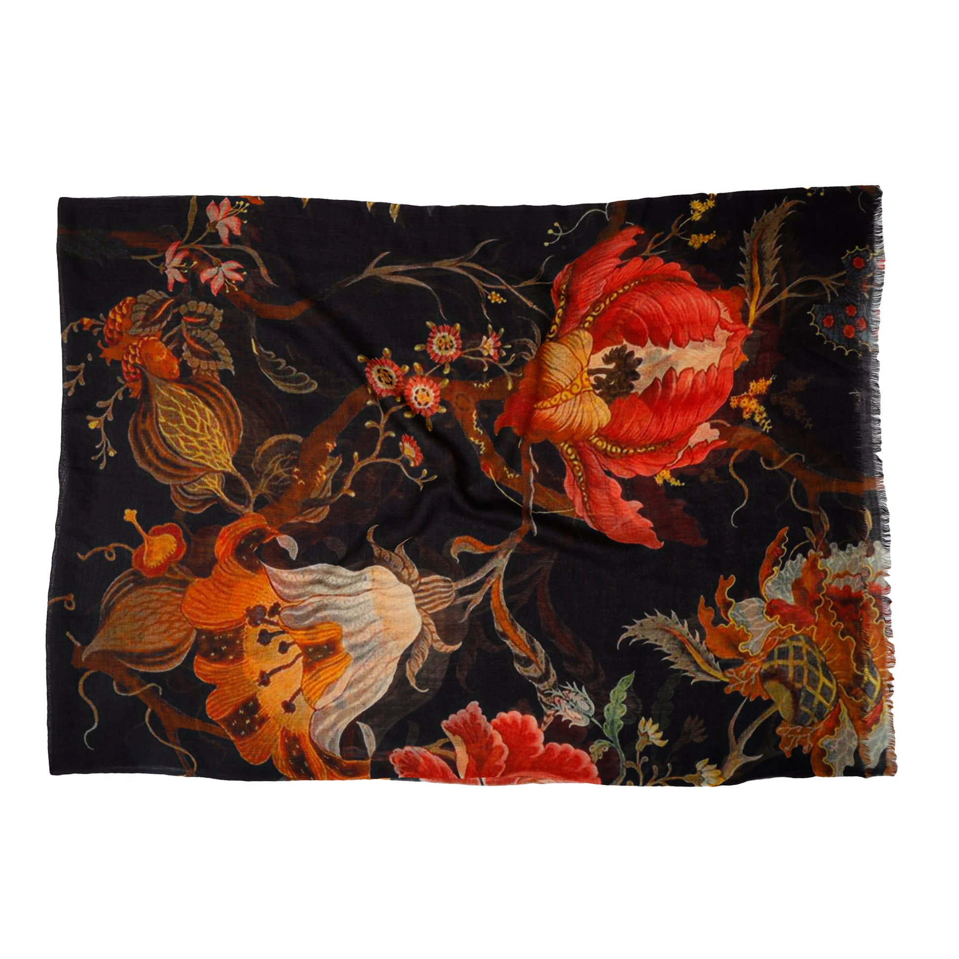 Baroque Bloom Scarf – Merino Wool Silk | Ornamental Vintage Floral Wrap on Black