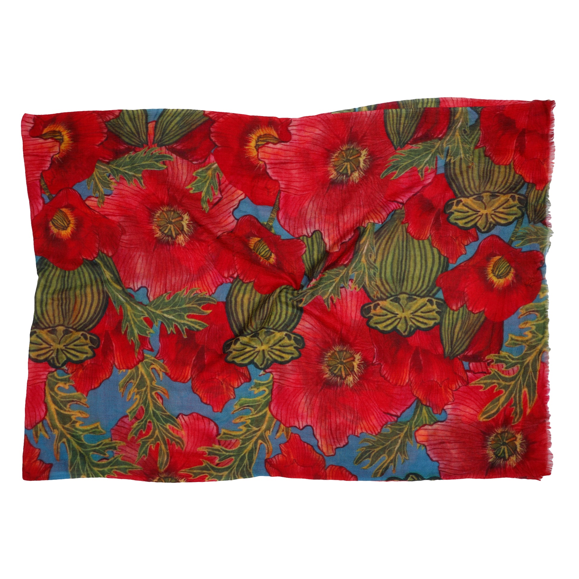 Scarlet Poppy Bloom Scarf – Merino Wool Silk | Bold Australian Botanical Wrap with Teal Blue Base