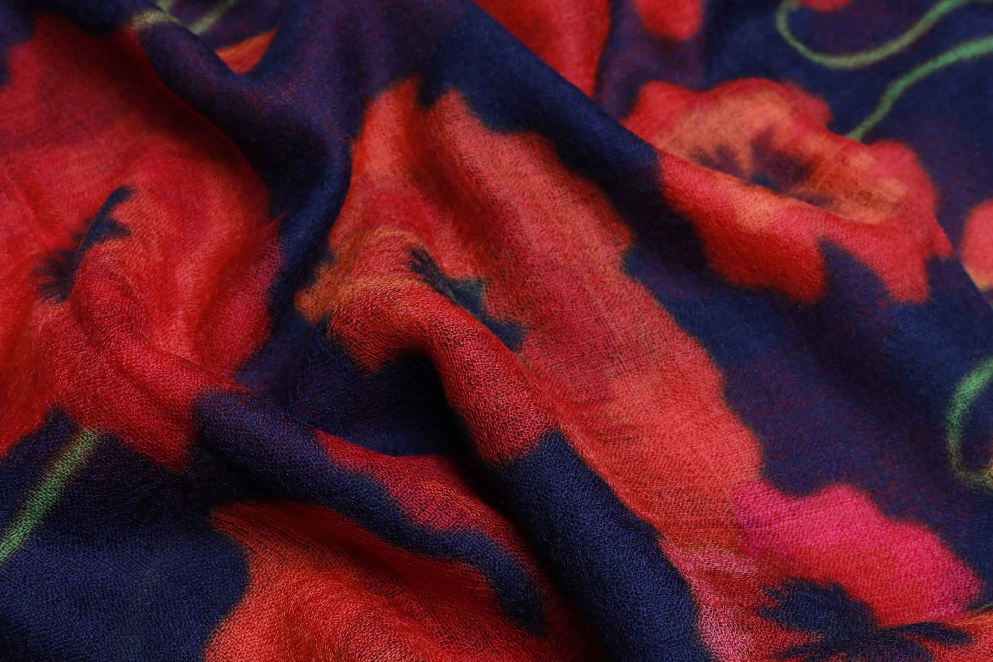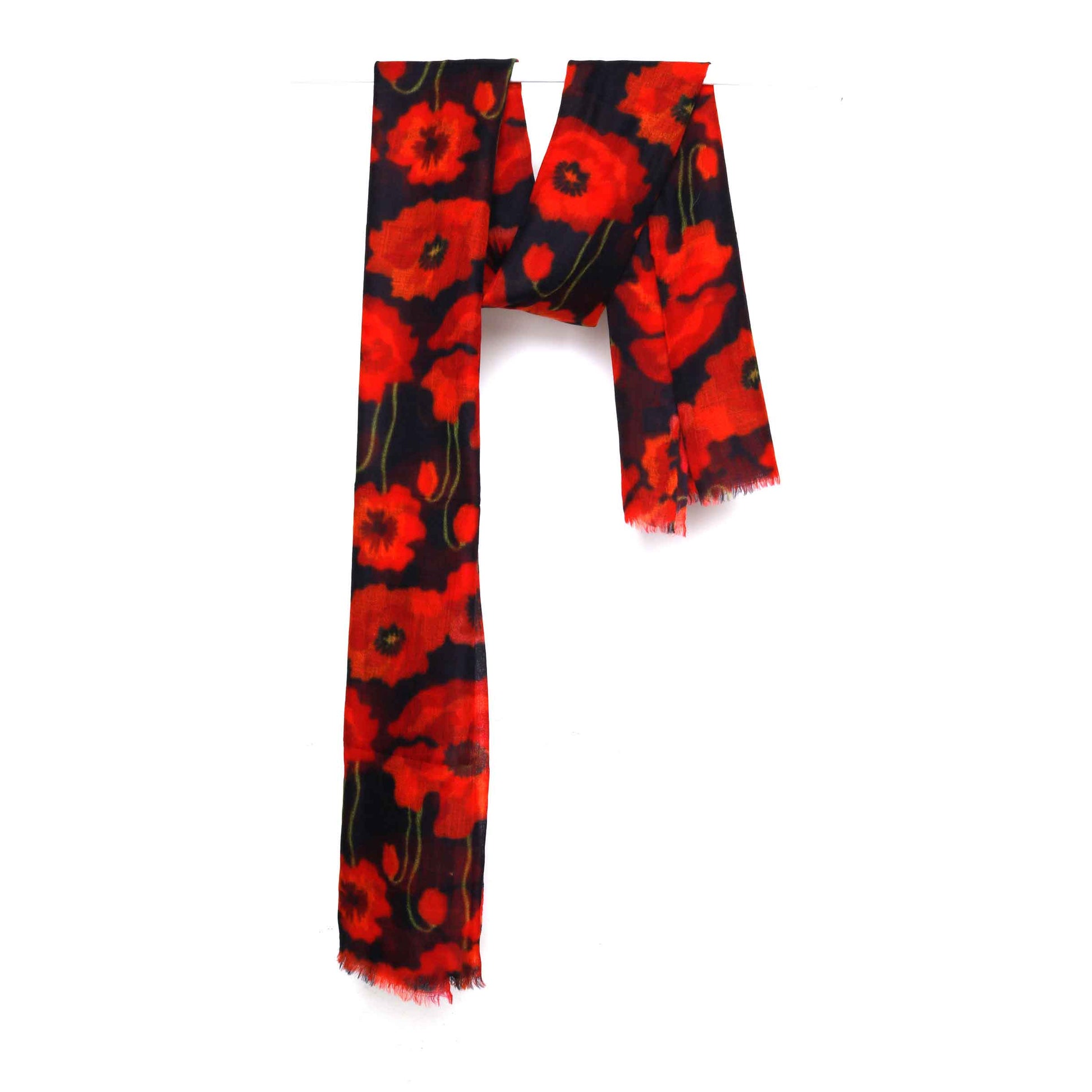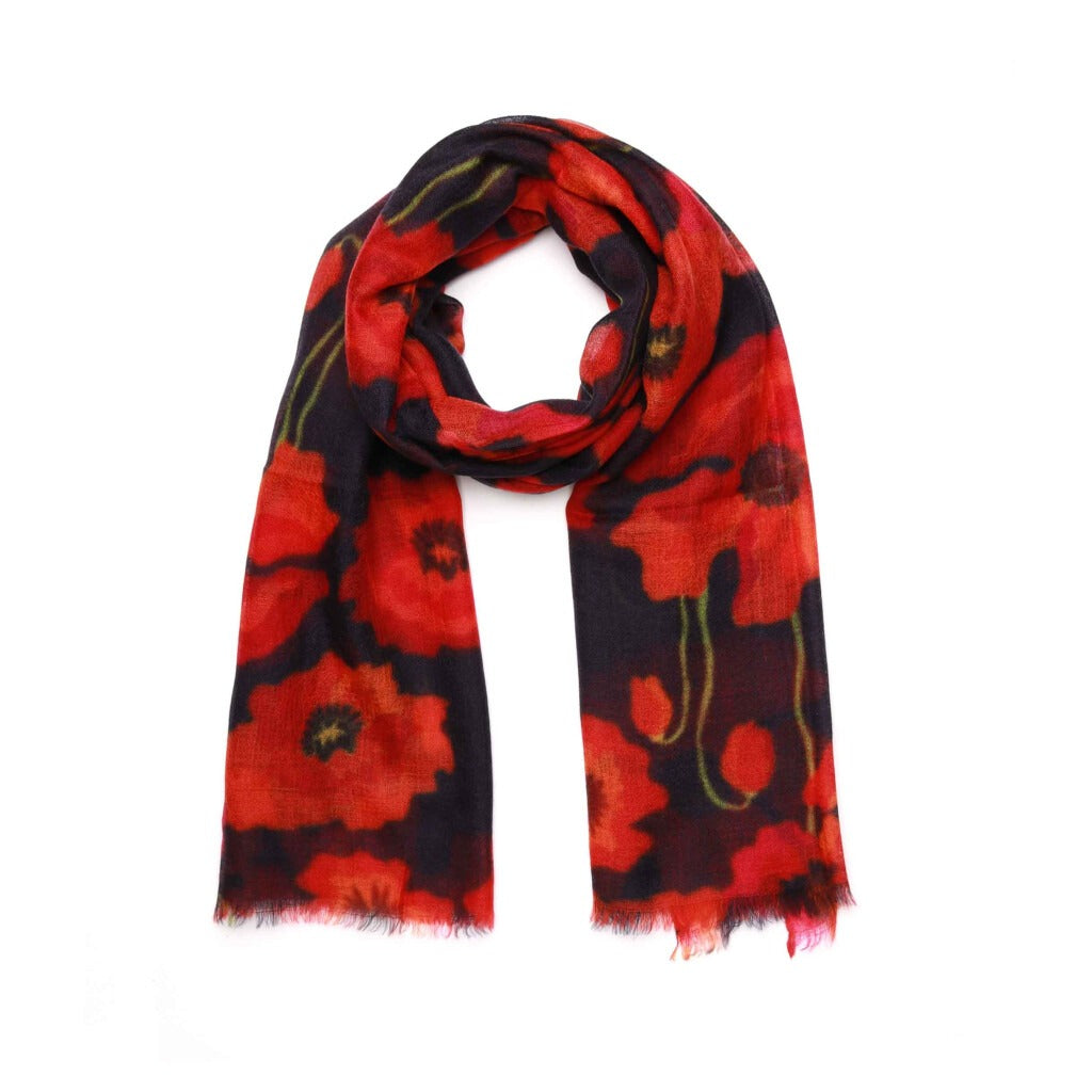 Poppy Bloom Scarf – Merino Fine Wool Wrap | Red & Scarlet Poppies on Radiant Black Canvas