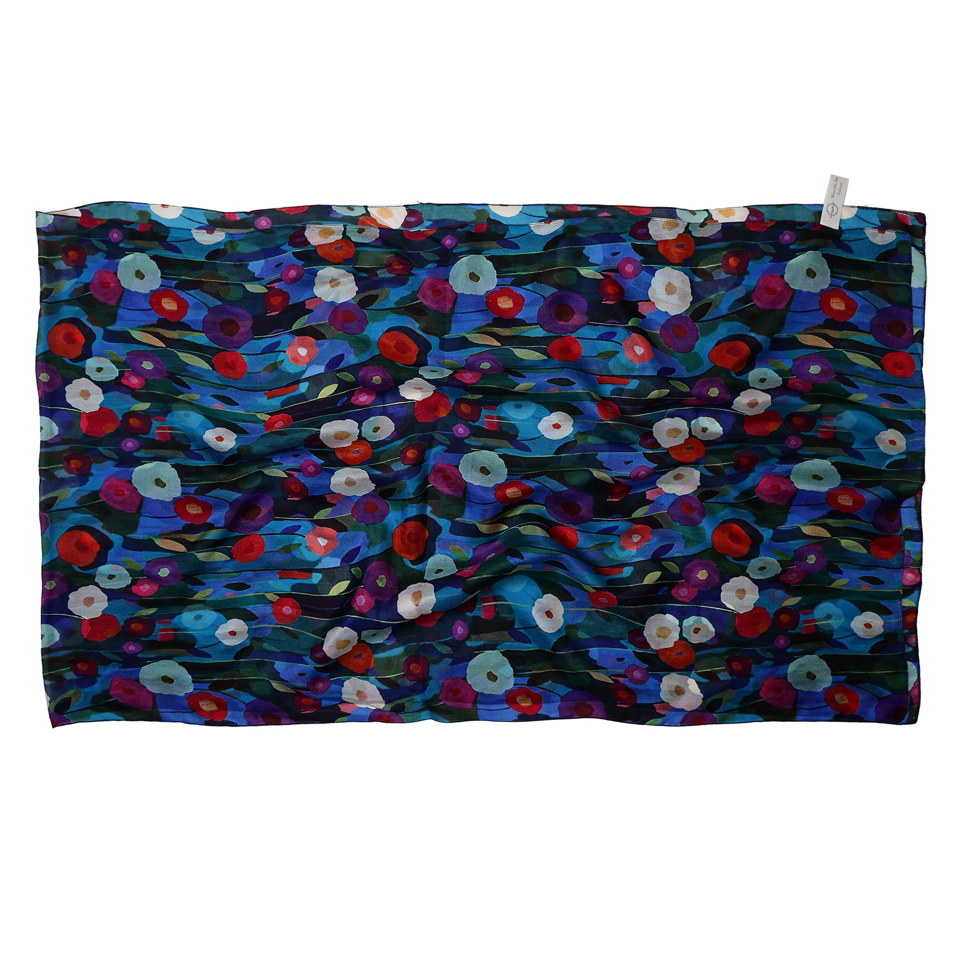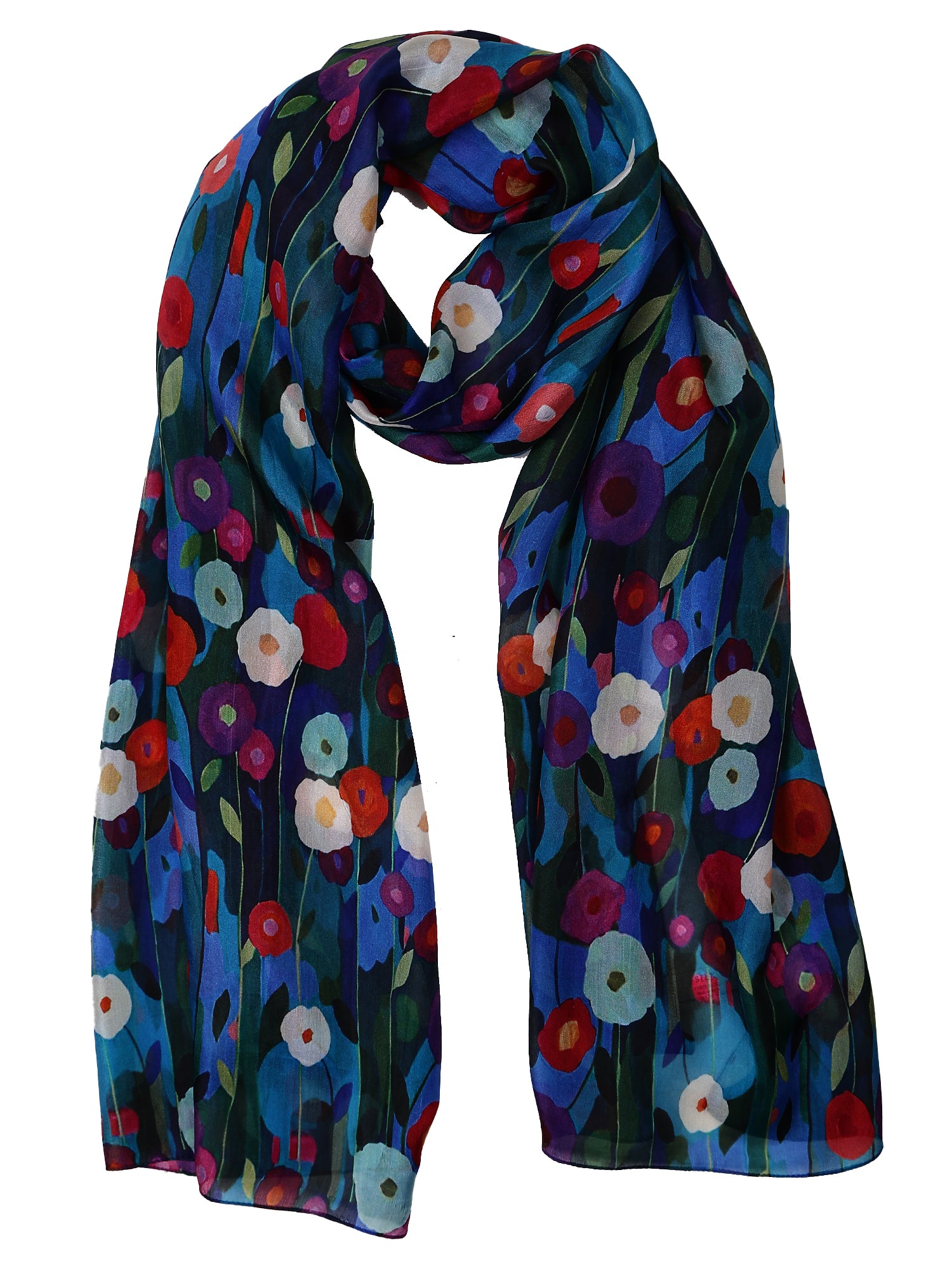 Azure Poppies Garden Bloom Scarf – Pure Silk | Artistic Floral Wrap with Bold Multicolor Blooms on Deep Blue Base