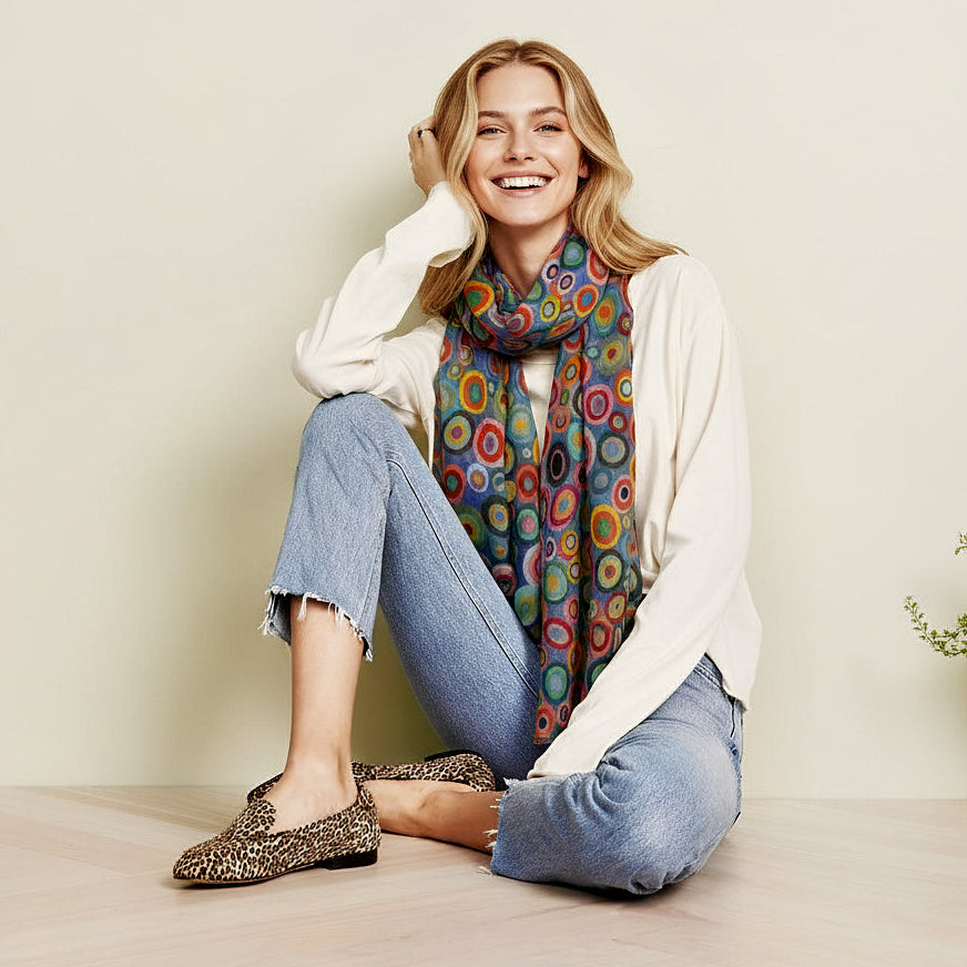 Kaleidoscope Circles Scarf – Merino Fine Wool | Vibrant Geometric Abstract Designer Wrap - Grey base