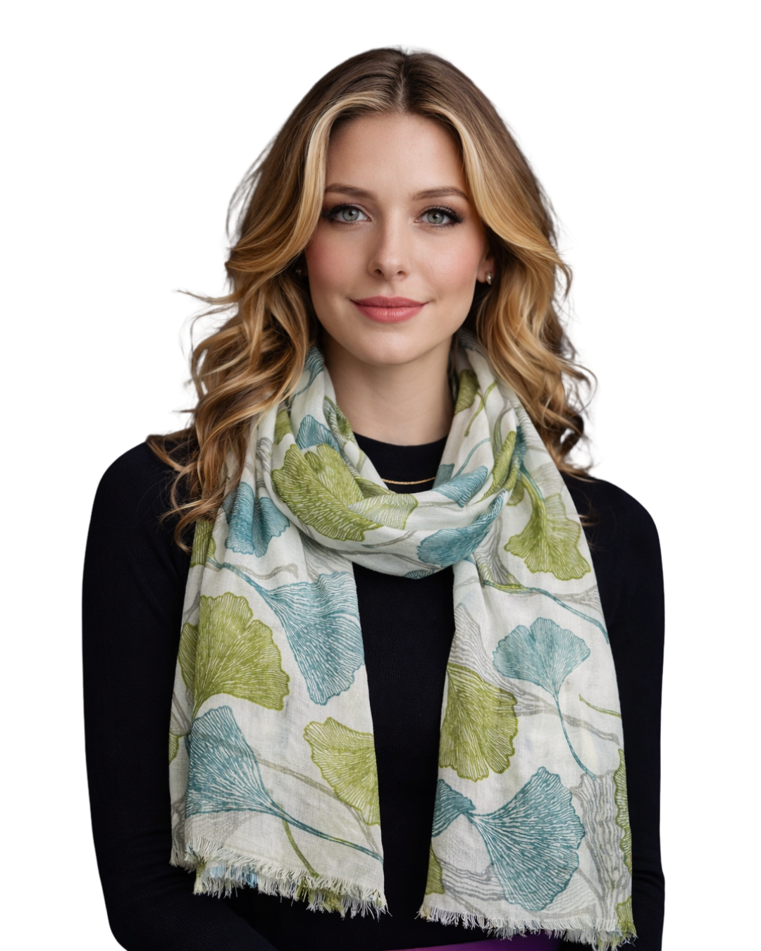 Autumn Ginkgo Leaf Scarf – Cotton Modal Designer Wrap | Japanese Botanical Nature Print- Green Tone