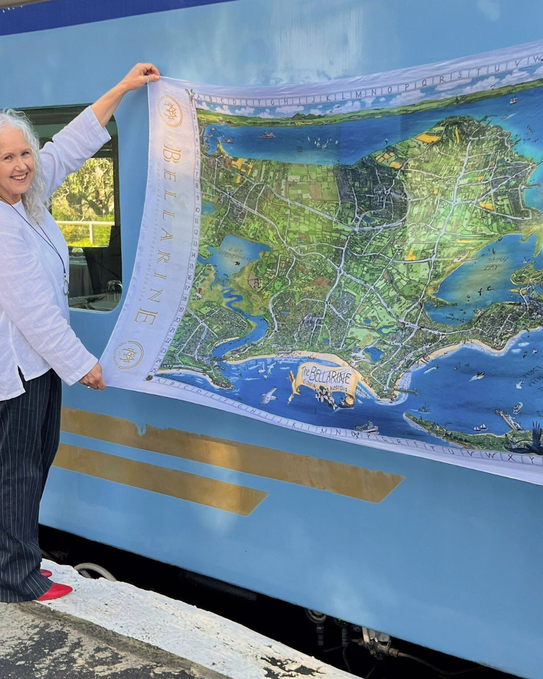 The artwork includes detailed coastal views, sailing boats, lighthouses, local landmarks, parklands and town layouts — making the scarf a truly wearable piece of art that brings the Bellarine’s natural beauty to life.